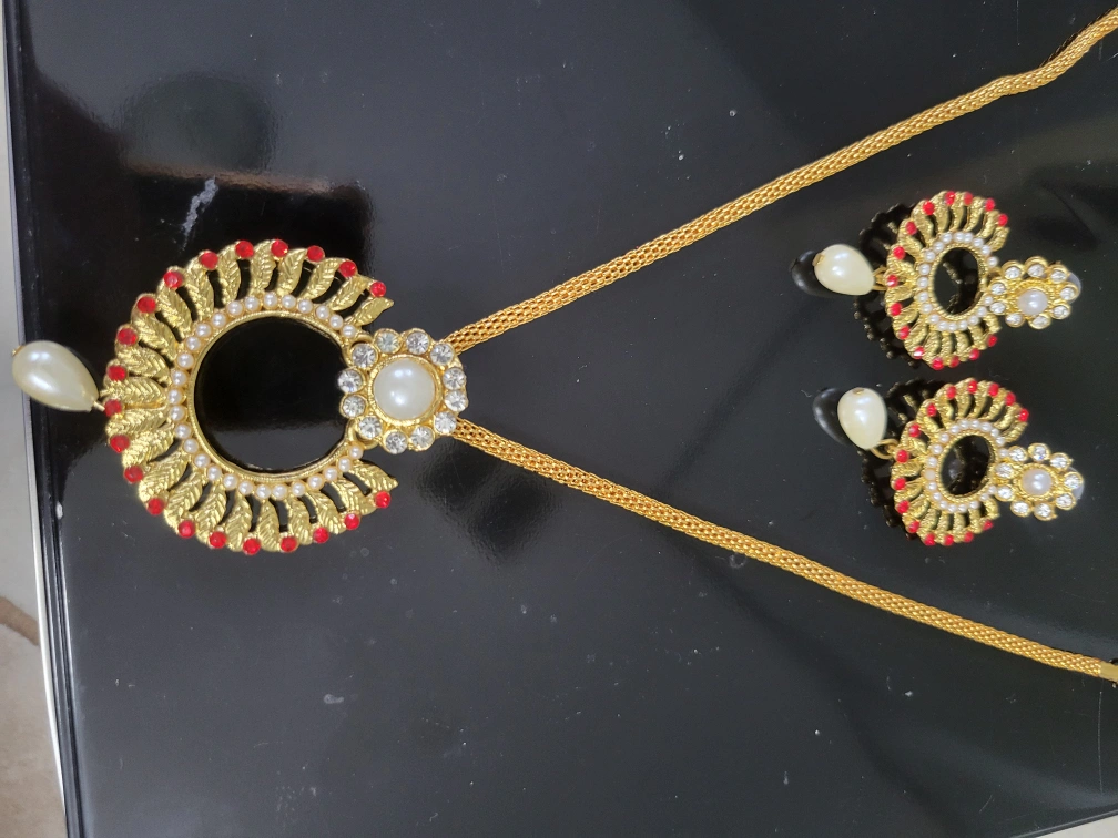 Beautiful gold-tone necklace and matching earring set. The necklace features a unique pendant design with pearl accents and red detailing. The earrings mirror the pendant's style. Perfect for adding a touch of elegance to any outfit!