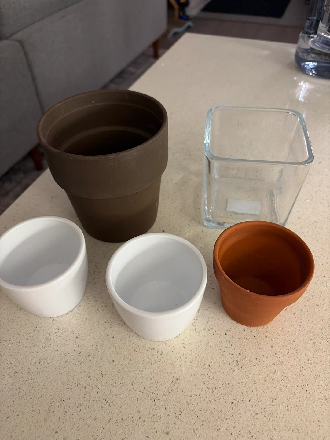 Selling a collection of assorted plant pots! There's a brown plastic pot, two small white ceramic pots, a small terracotta pot, and a square glass vase. Perfect for starting a little indoor garden or repotting some of your plants. Some of them are brand new, others a little used.