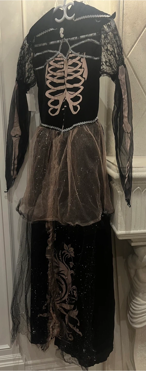 238Dress up costume for Halloween or any costume party! It is a black dress with a skeleton design on the front and a shimmery skirt.