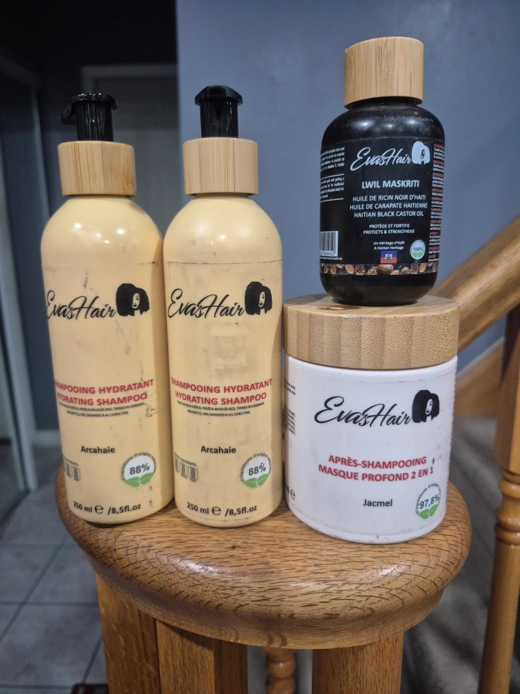 10Selling a set of Eva's Hair products! This includes: - Hydrating Shampoo - Après-Shampooing Masque Profond 2 en 1 - Lwil Maskriti Haitian Black Castor Oil All products are 250ml.