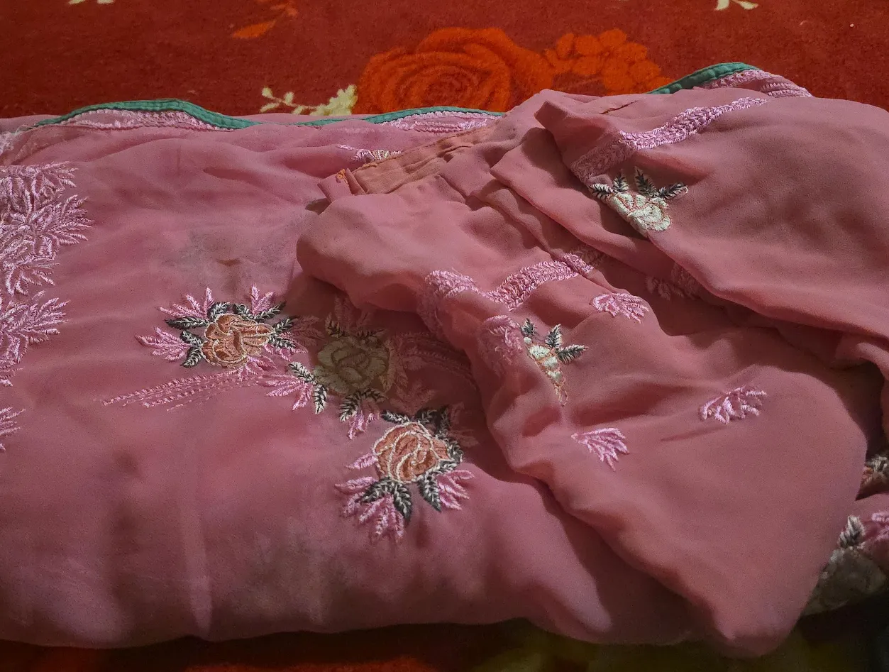 Beautiful pink chiffon saree with delicate floral embroidery! The fabric is lightweight and flowy, perfect for a special occasion.