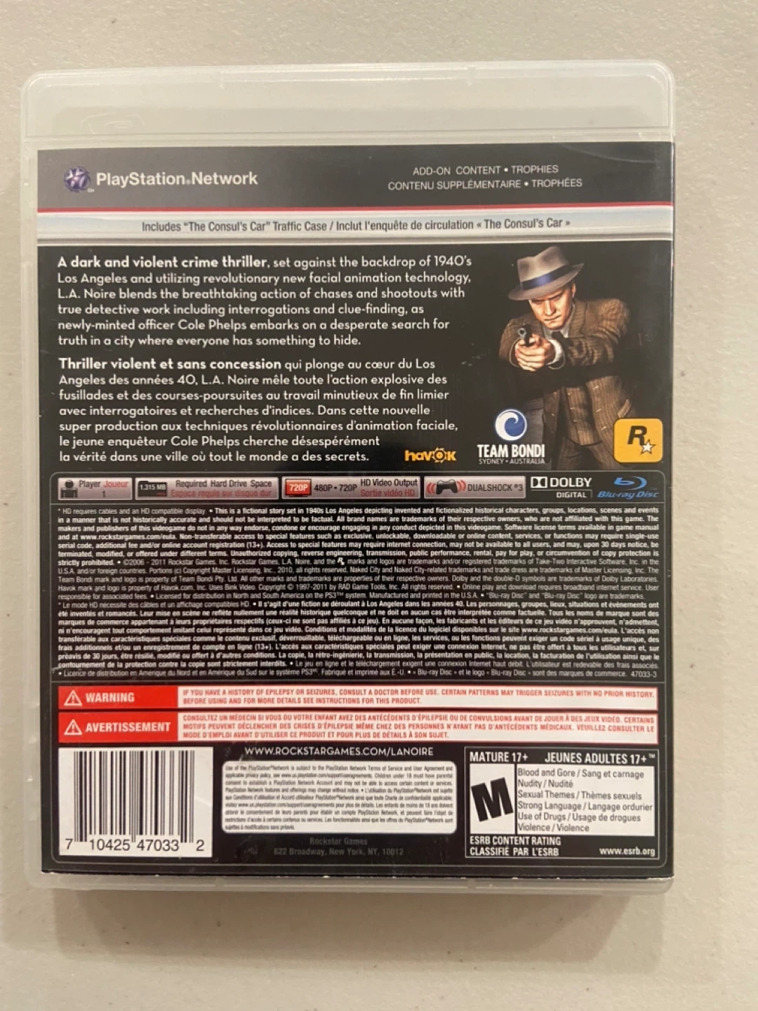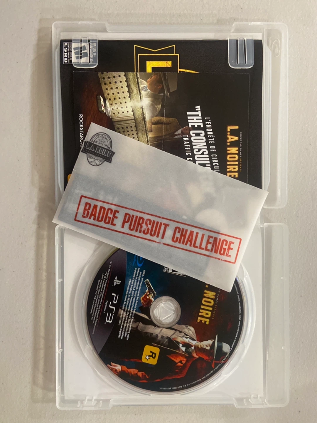 127Selling L.A. Noire for the Playstation 3! This dark and violent crime thriller is set against the backdrop of 1940's Los Angeles. Included is the game disc, case, and "Badge Pursuit Challenge" insert