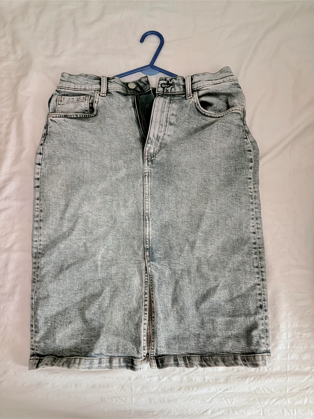 Here's a denim skirt in a light grey wash. It's in great condition and ready for a new home! Perfect for a casual look or dressing up with some cute boots