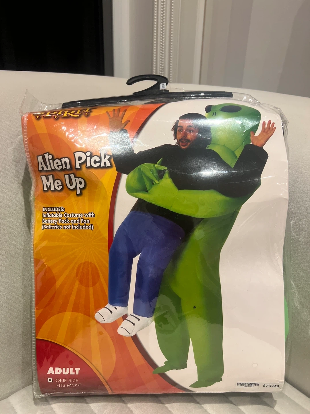 Get ready for some laughs with this Spirit Halloween Alien Pick Me Up costume! It's an inflatable costume that includes the battery pack and fan (batteries not included). It's adult size, and one size fits most. Originally priced at $74.99.