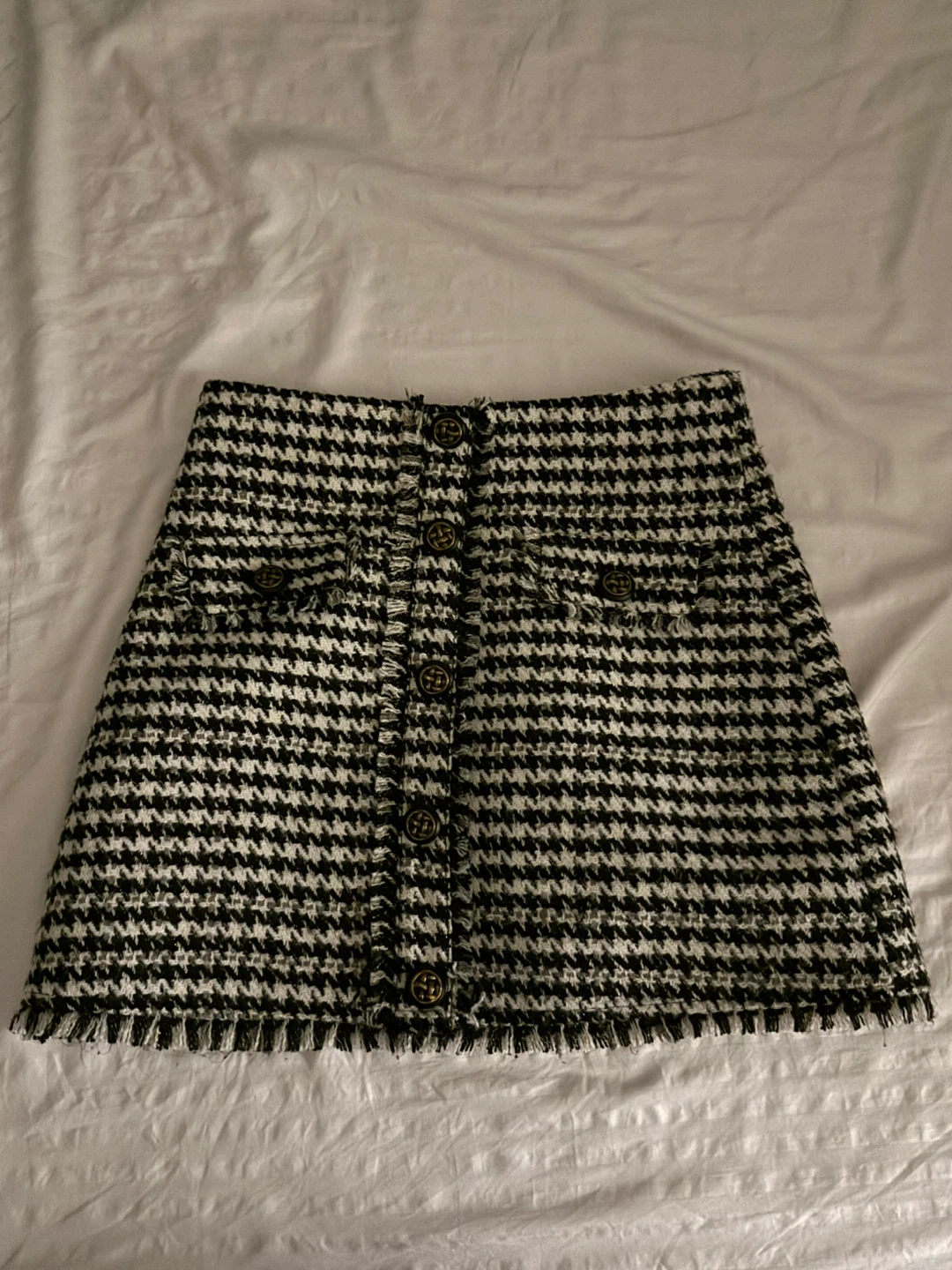 Cute houndstooth mini skirt! It's in great condition and features a classic black and white pattern with gold-tone buttons down the front. Perfect for adding a touch of sophistication to any outfit