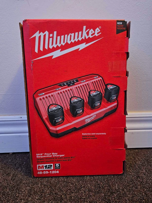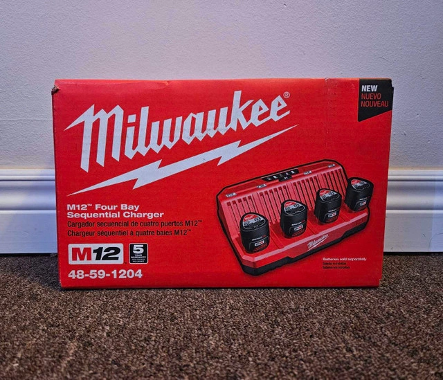 Brand new Milwaukee M12 Four Bay Sequential Charger, model 48-59-1204, designed to efficiently charge your M12 batteries! Key Features: * Four Bay Sequential Charging: Charges up to four M12 batteries in sequence. * Optimized Charging: Enhances battery life and charging speed. * Compact Design: Easy to store and transport. Condition: New For Sale By: Owner Curbside pick up: Yes Cash accepted: Yes