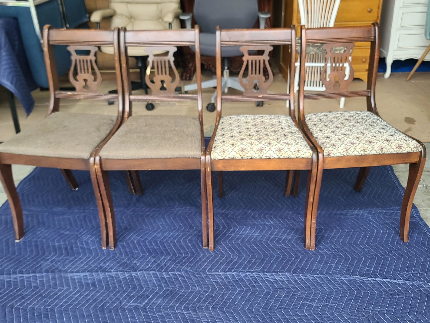 Only need a bit of TLC. Two chairs feature a solid brown upholstered seat, while the other two have a patterned fabric. These chairs would add a touch of vintage charm to any dining space. Measurements to follow. Delivery can be arranged. Viewing and pickup by appointment.