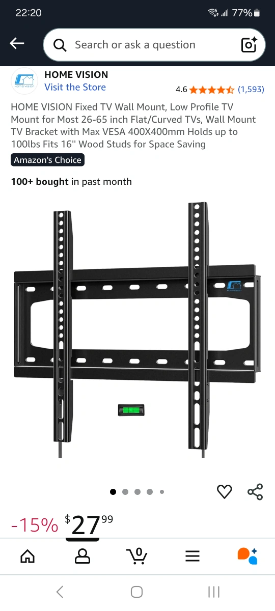 Selling a new HOME VISION fixed TV wall mount, model HV8401. It's designed for most 26-65 inch flat/curved TVs and can hold up to 100lbs. Includes the wall mount bracket and hardware for installation. Unopened.