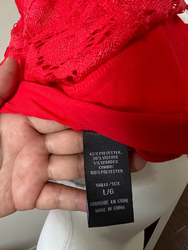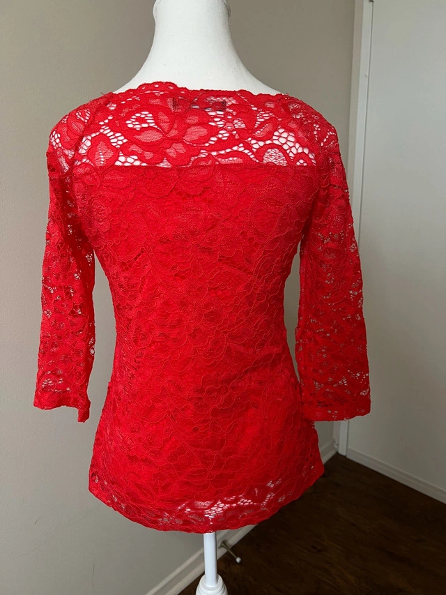 This is a gently worn Le Chateau/Suzy Shier red lace top, featuring a 3/4 sleeve and a flattering cut. It's in good condition and ready to add a pop of colour to your wardrobe! Size - L
