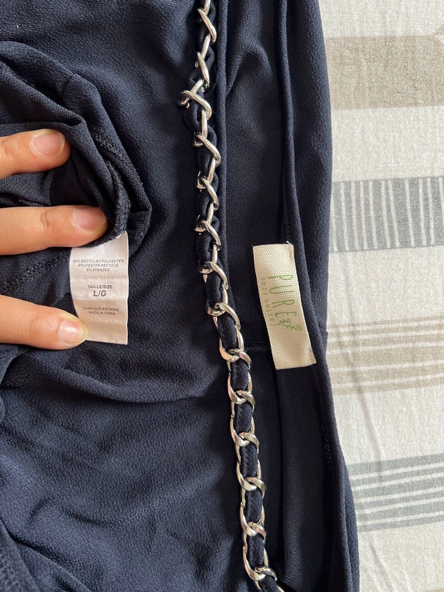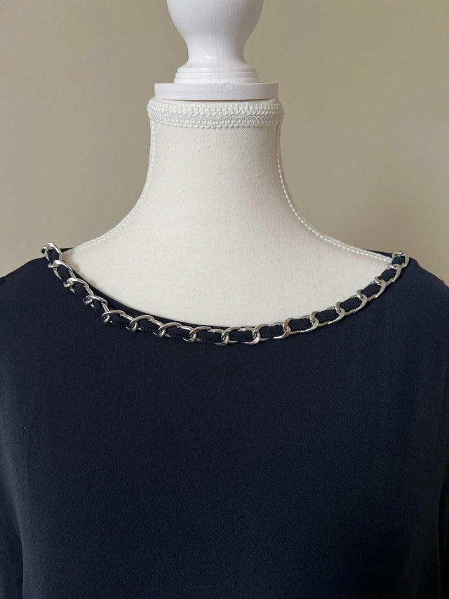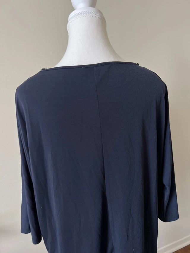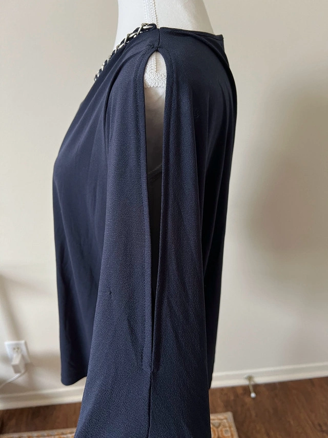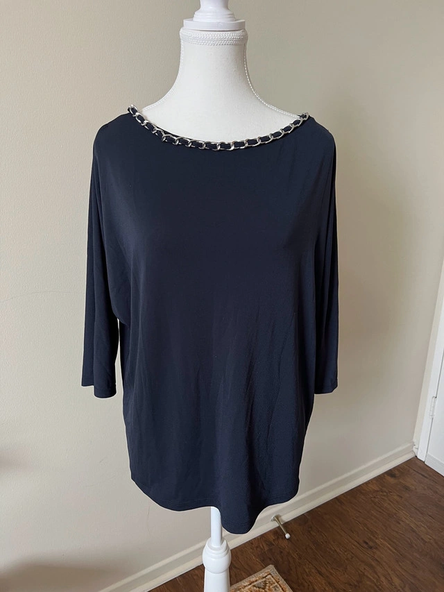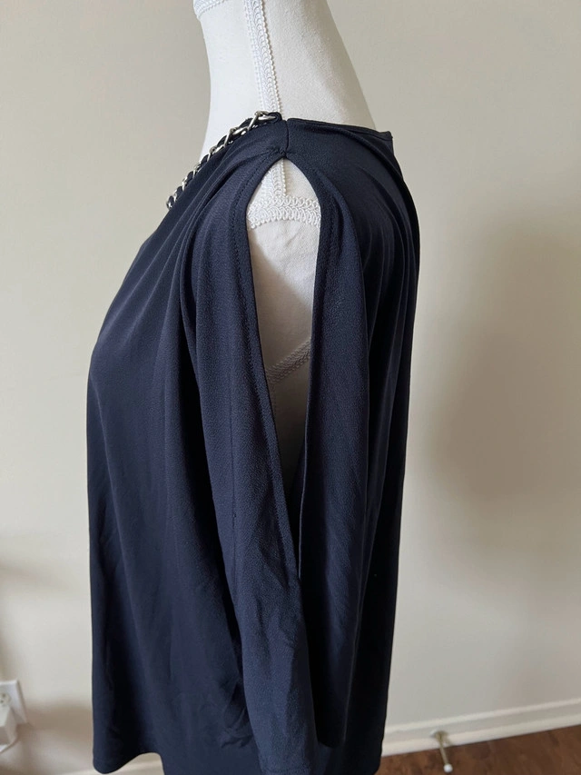Lovely navy blue chain-neck top in a size large. It features stylish 3/4 length sleeves with unique arm slits. This top is gently worn and in good condition.