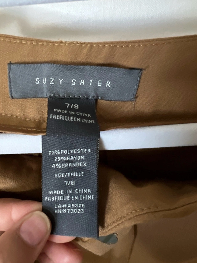 10Suzy Shier dress pants in size 7/8. They are in good condition and feature a stylish cut. These pants are made from a comfortable blend of 73% polyester, 23% rayon, and 4% spandex. Specifications: * Brand: Suzy Shier * Size: 7/8 * Material: 73% Polyester, 23% Rayon, 4% Spandex