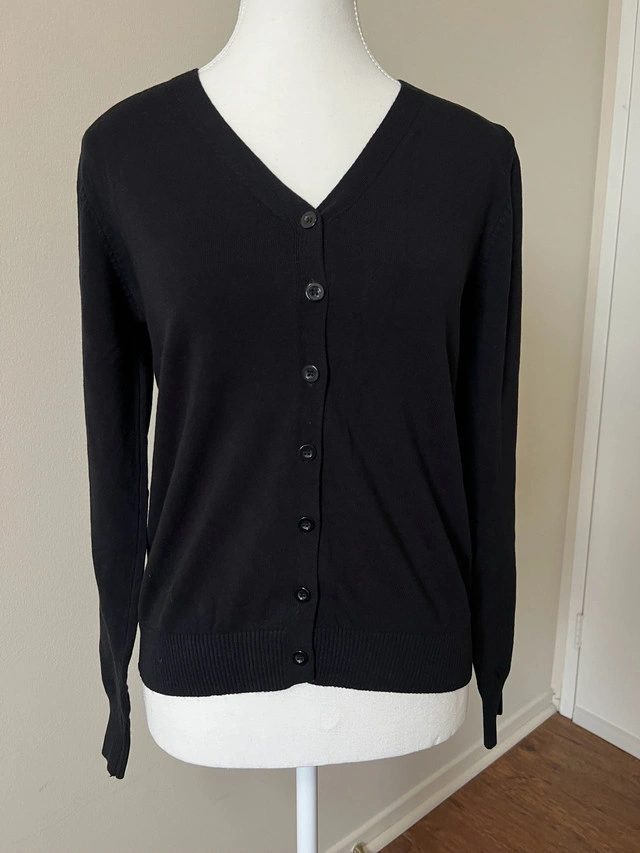 This is a gently worn black cardigan, perfect for layering and adding a touch of sophistication to any outfit. The cardigan features a classic V-neck and button-down front. It's in good condition. * Classic V-neck design * Button-down closure * Long sleeves * Ribbed cuffs and hem