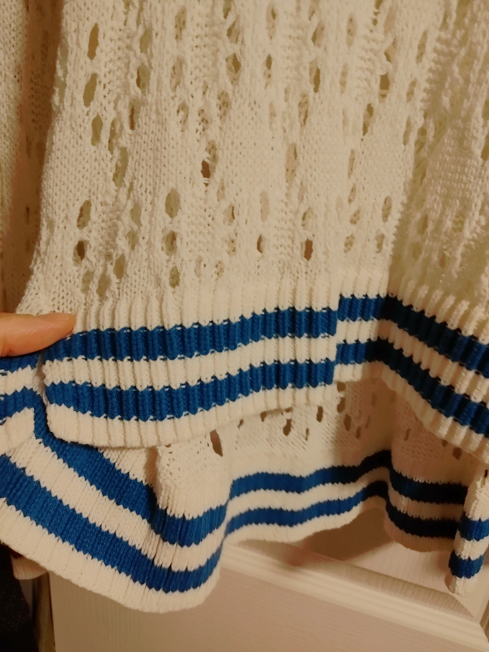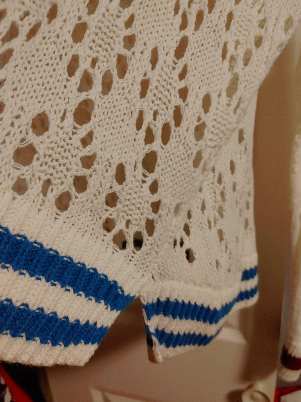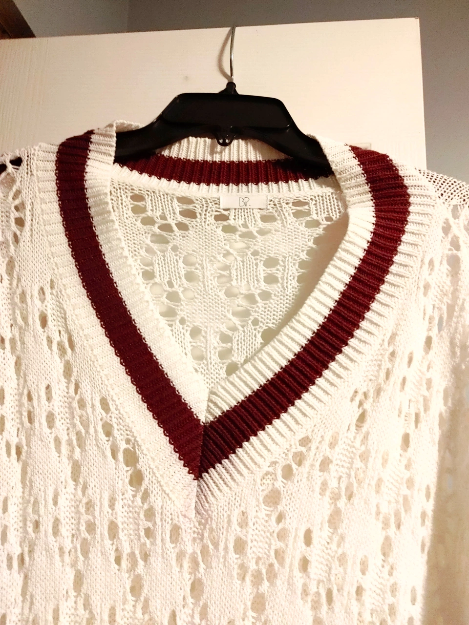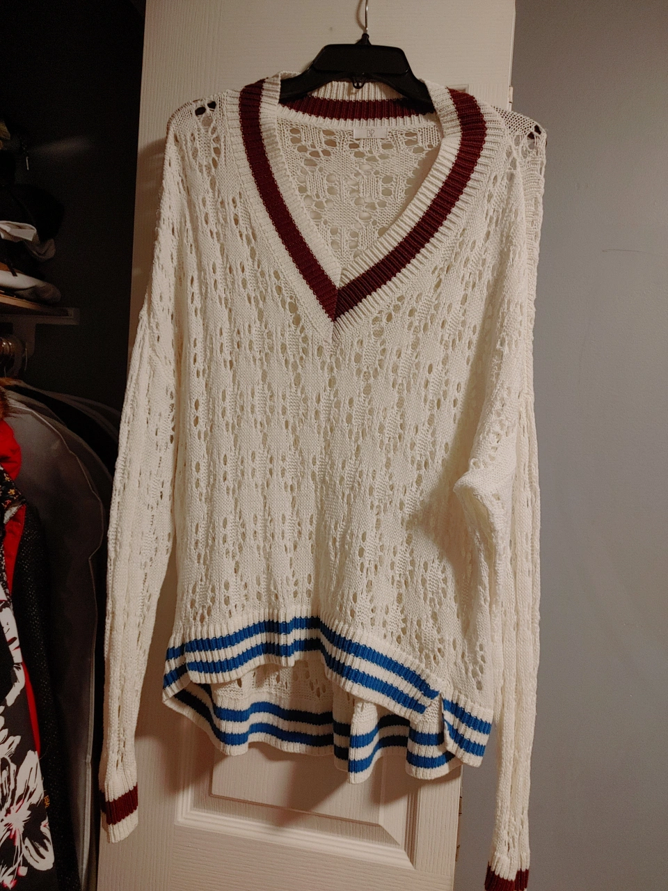 A cute white knit sweater with a V-neck design! It features blue and maroon striped detailing on the bottom and sleeves. Perfect for layering or wearing on its own on a cool day never been worn