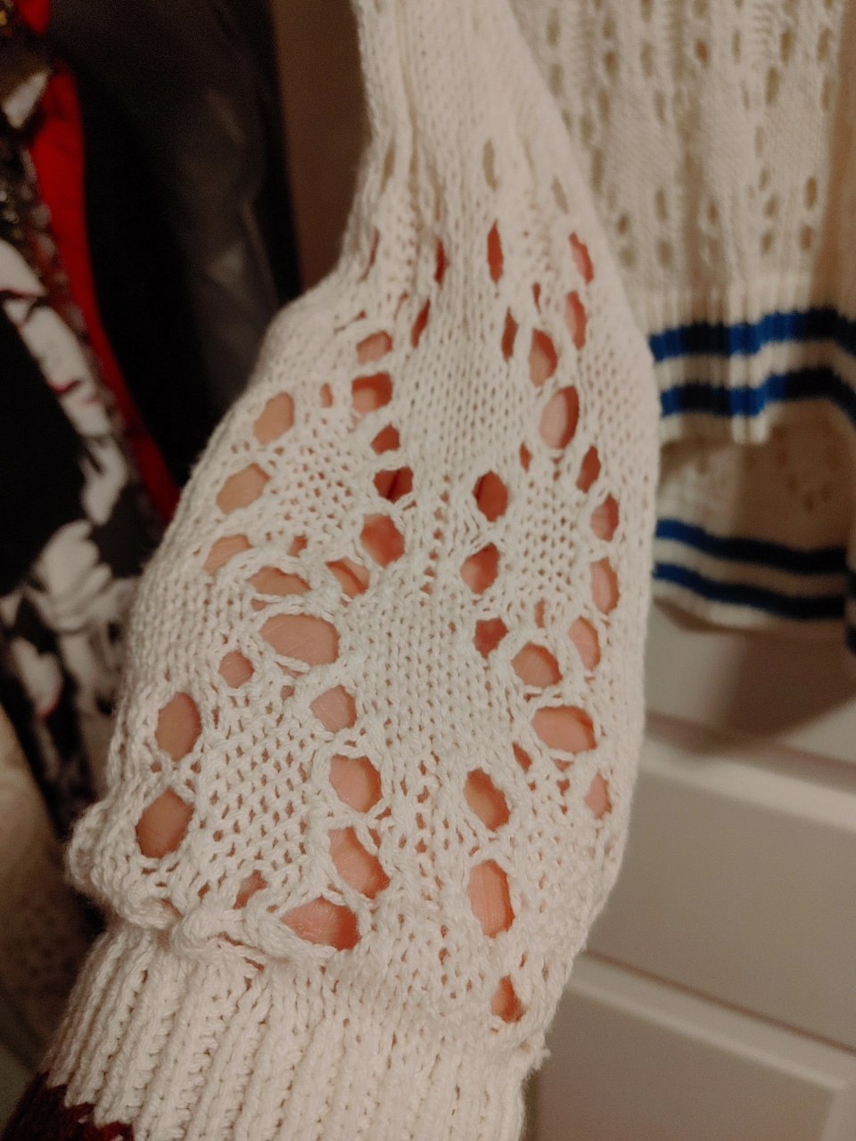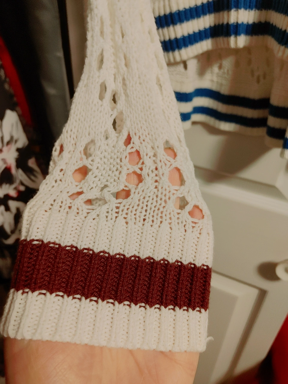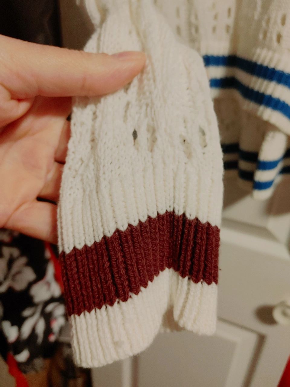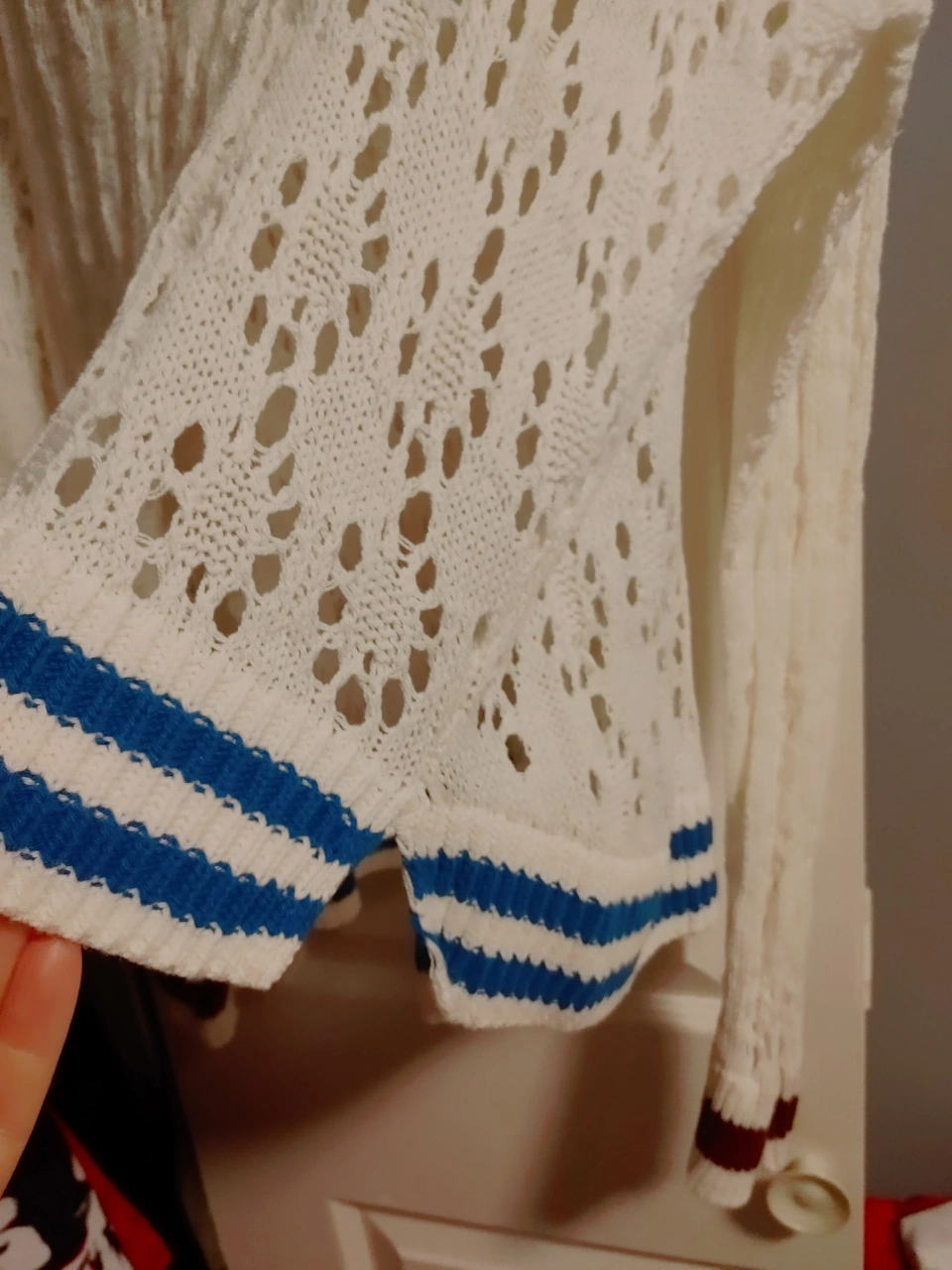 A cute white knit sweater with a V-neck design! It features blue and maroon striped detailing on the bottom and sleeves. Perfect for layering or wearing on its own on a cool day never been worn