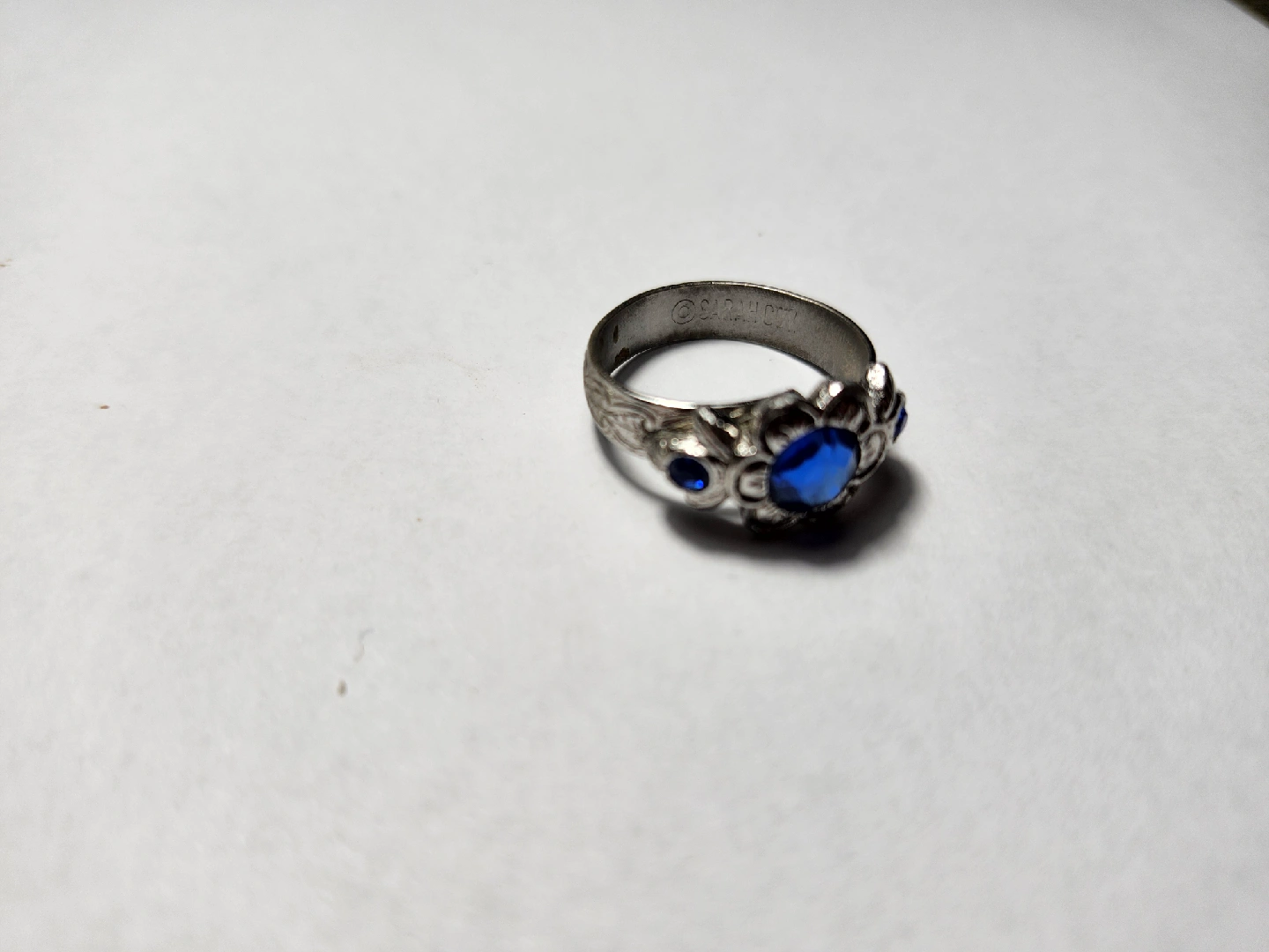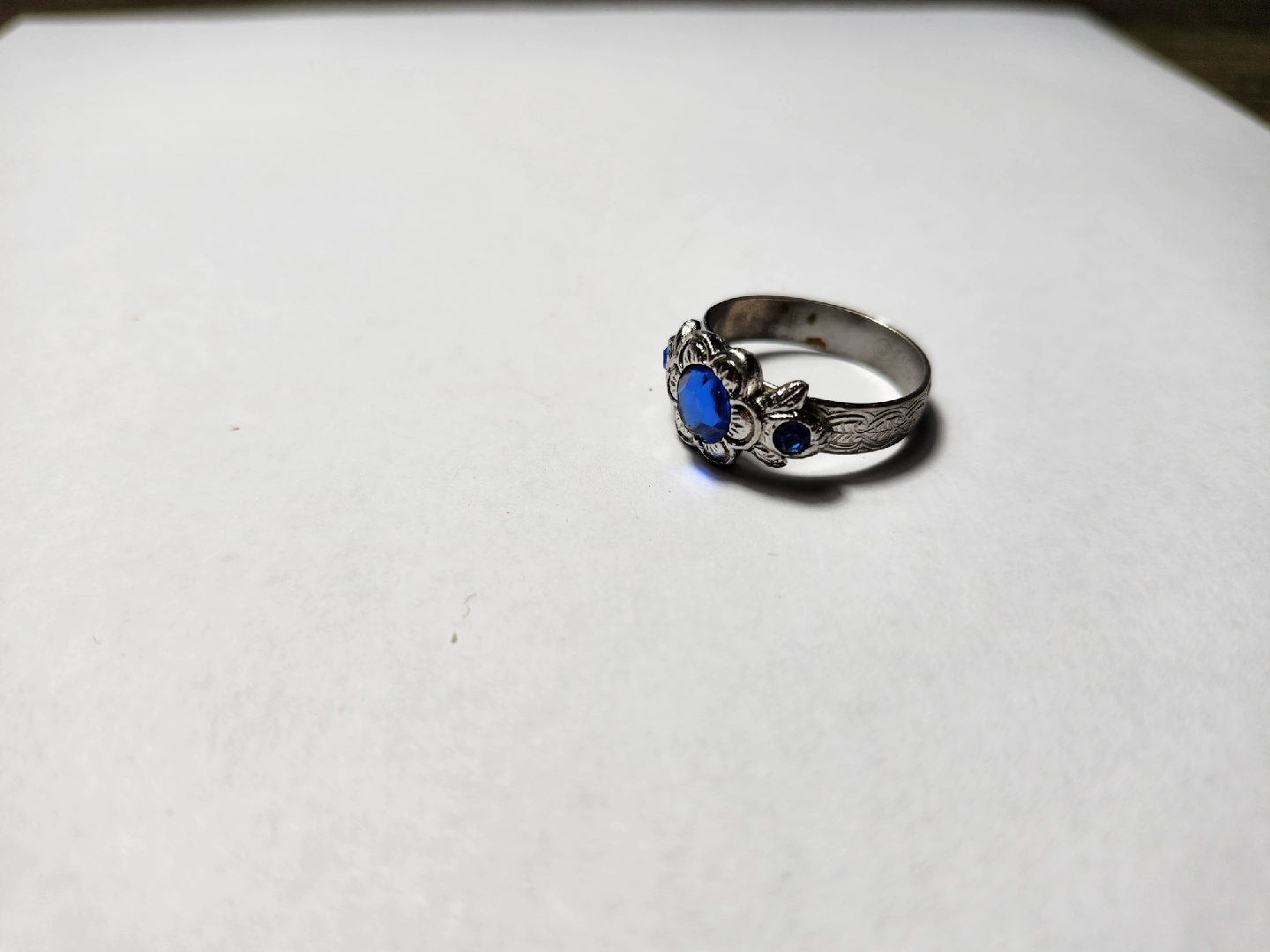 A beautiful silver toned ring featuring a vibrant blue stone. The ring has a detailed design around the band, adding to its unique charm. It's in great condition and ready to be worn!