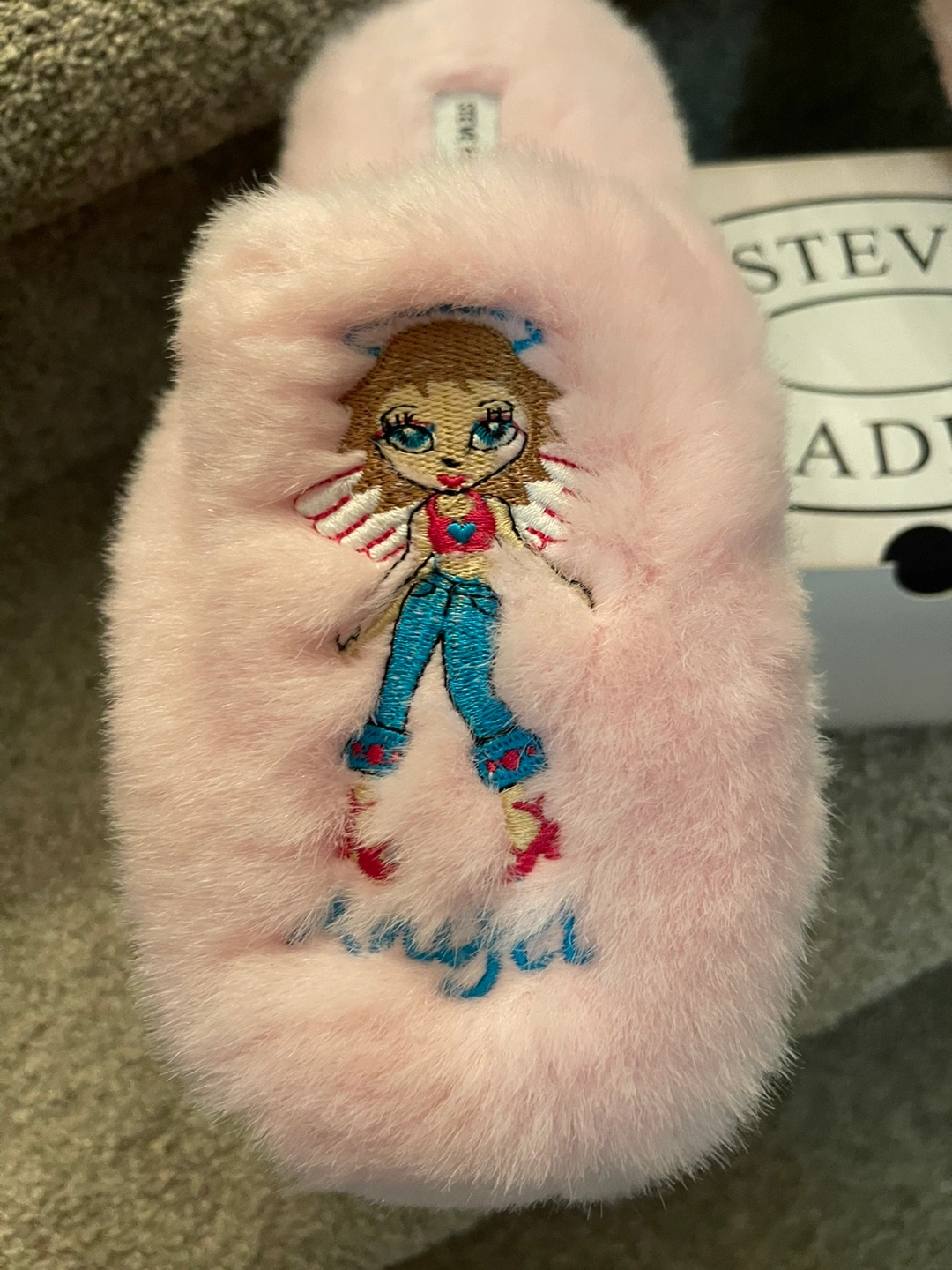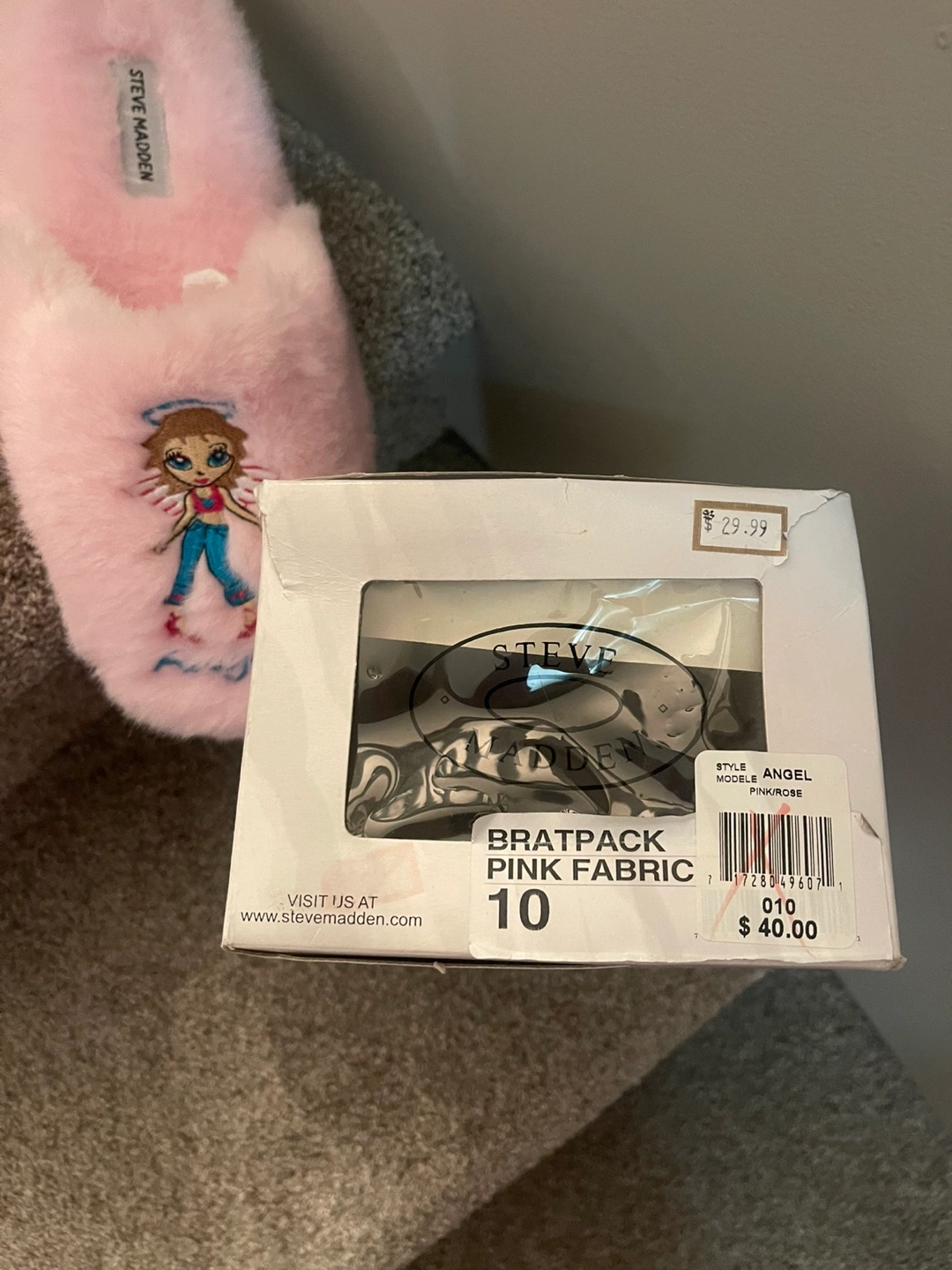 PERFECT for CHRISTMAS GIFTS!!!Selling 2 pairs - Ladies Steve Madden ANGEL BRATPACK slippers in a size 10! One pair is a pretty pink and other pair is a gorgeous black. EACH pair have the cutest decorative “girl” on the front of each slipper. They are super cute and so so comfy. The ORIGINAL price tag on the box is $40.00 on sale for 29.99+tax = 31.49 - box included! Will sell EACH pair for 22.00.
