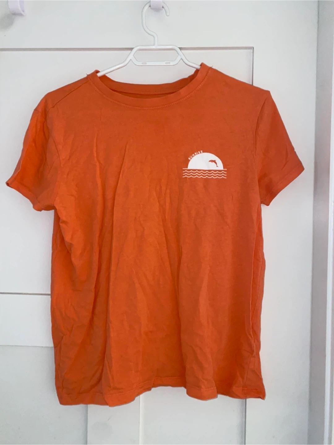 Selling a Primark printed tee in size medium. It's a vibrant orange colour with a cute sunrise and dolphin design. It's in great condition and ready for a new home!