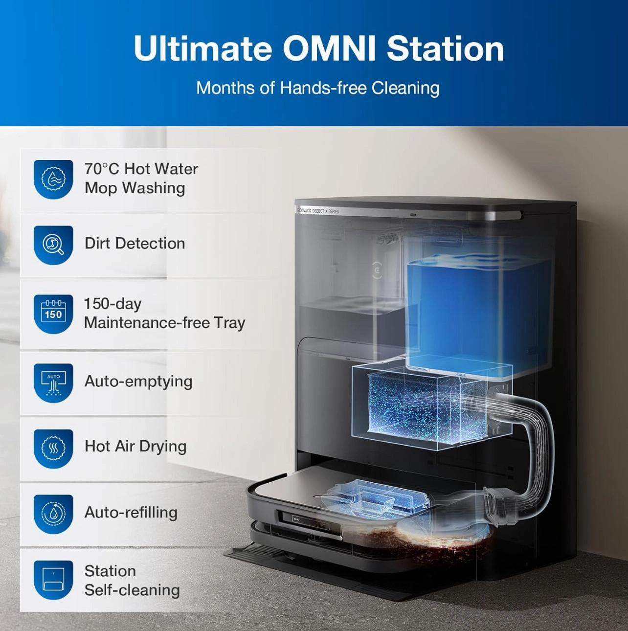 The ultimate Omni Station offers months of hands-free cleaning with features like 70°C hot water mop washing, dirt detection, a 150-day maintenance-free tray, auto-emptying, hot air drying, auto-refilling, and station self-cleaning