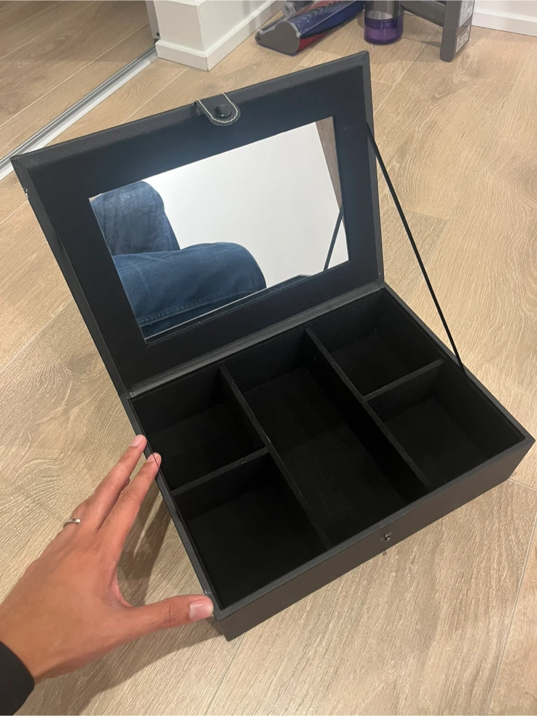 Selling a black jewellery box! It comes with a mirror inside, perfect for organizing your favourite pieces. The box is in great condition and ready for a new home