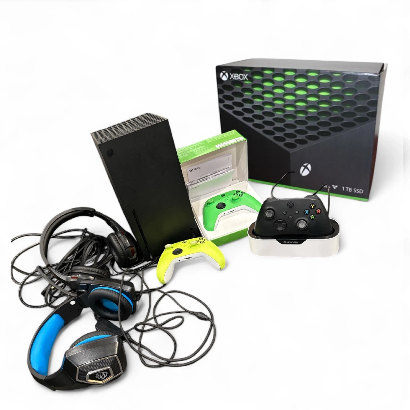 Selling an Xbox Series X console with multiple accessories! Included are: - Xbox Series X console - Three Xbox controllers (free) - Controller charging dock (free) - Two gaming headsets (free) Everything is in great condition (two controllers need updates) and ready for a new home
