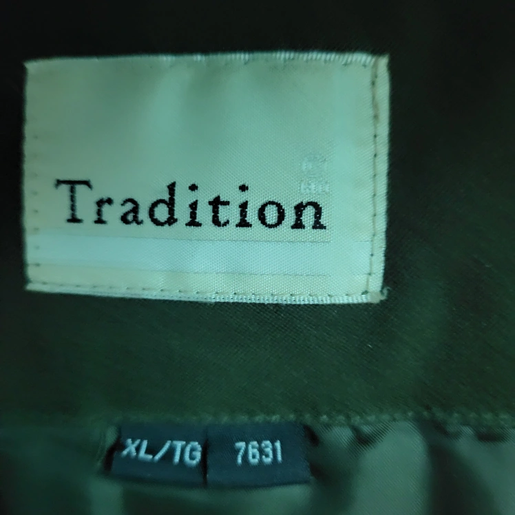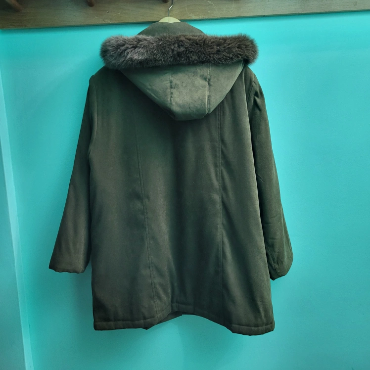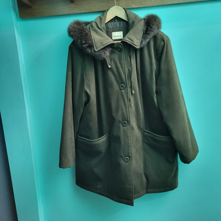 Here's a warm and stylish olive green winter coat from Tradition! It's a size XL and features a cozy fur-trimmed hood. remove hood. Perfect for staying snug during the colder months