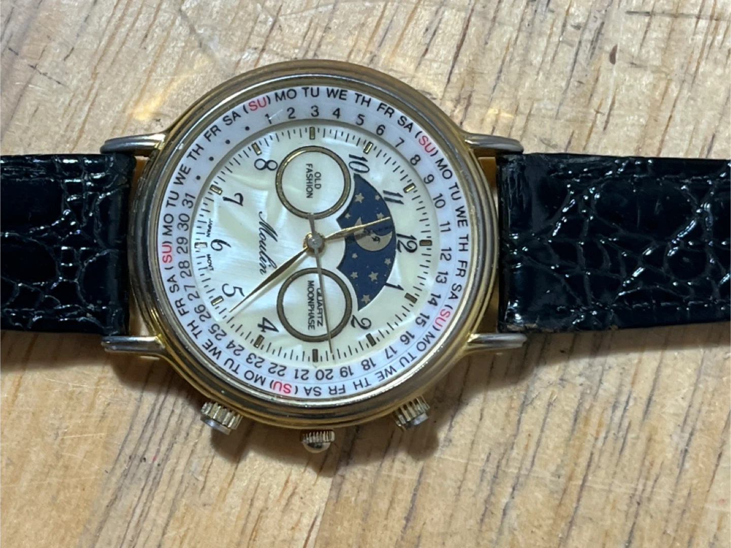 Selling a Moulin Quartz Moonphase watch with a black leather strap. The watch features a moonphase display and an 'old fashion' subdial. It's a unique timepiece! Needs a battery.