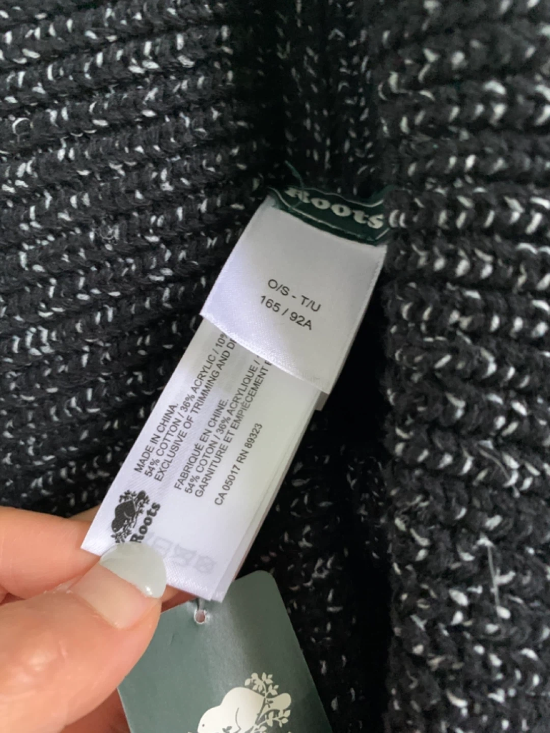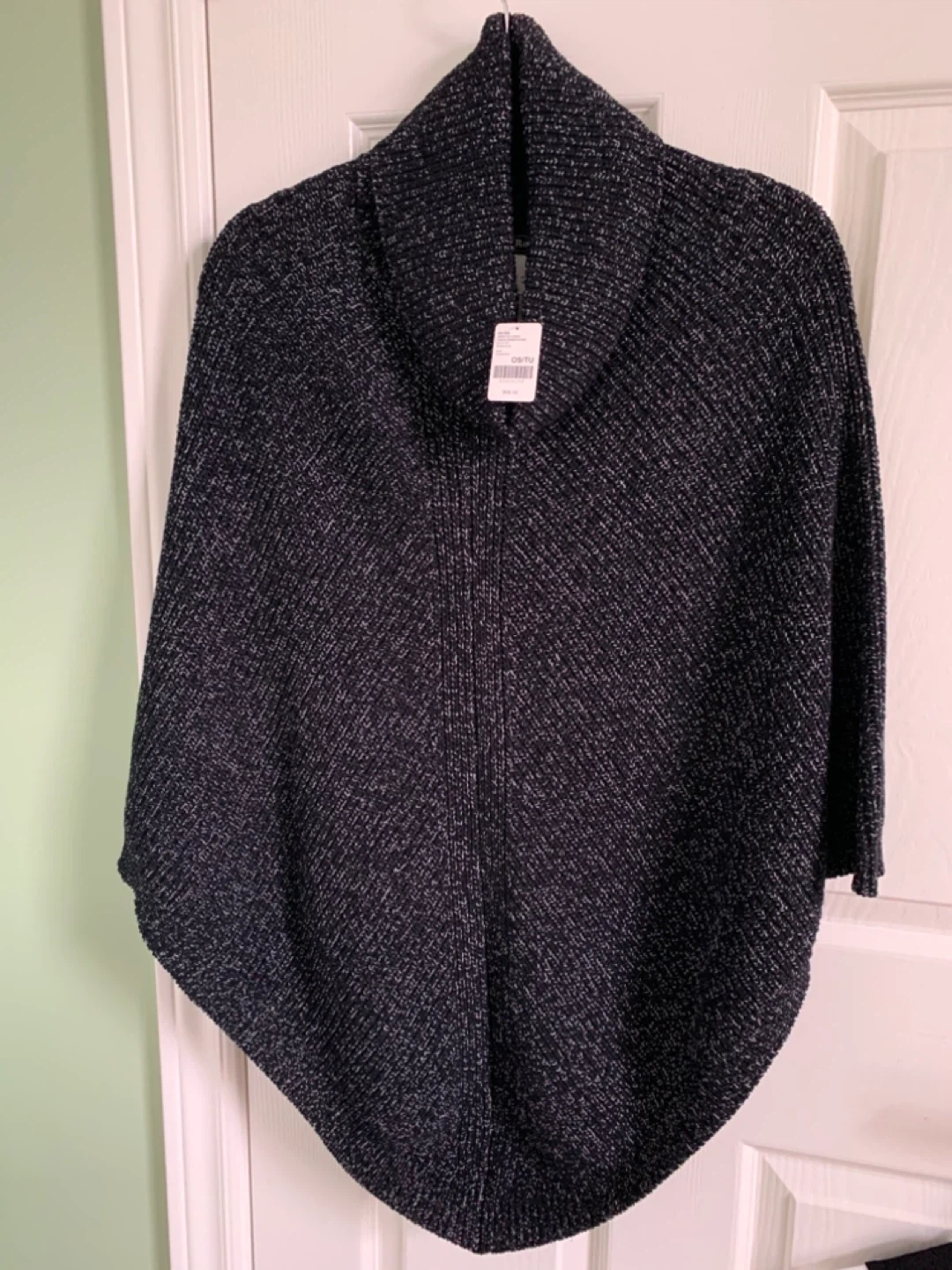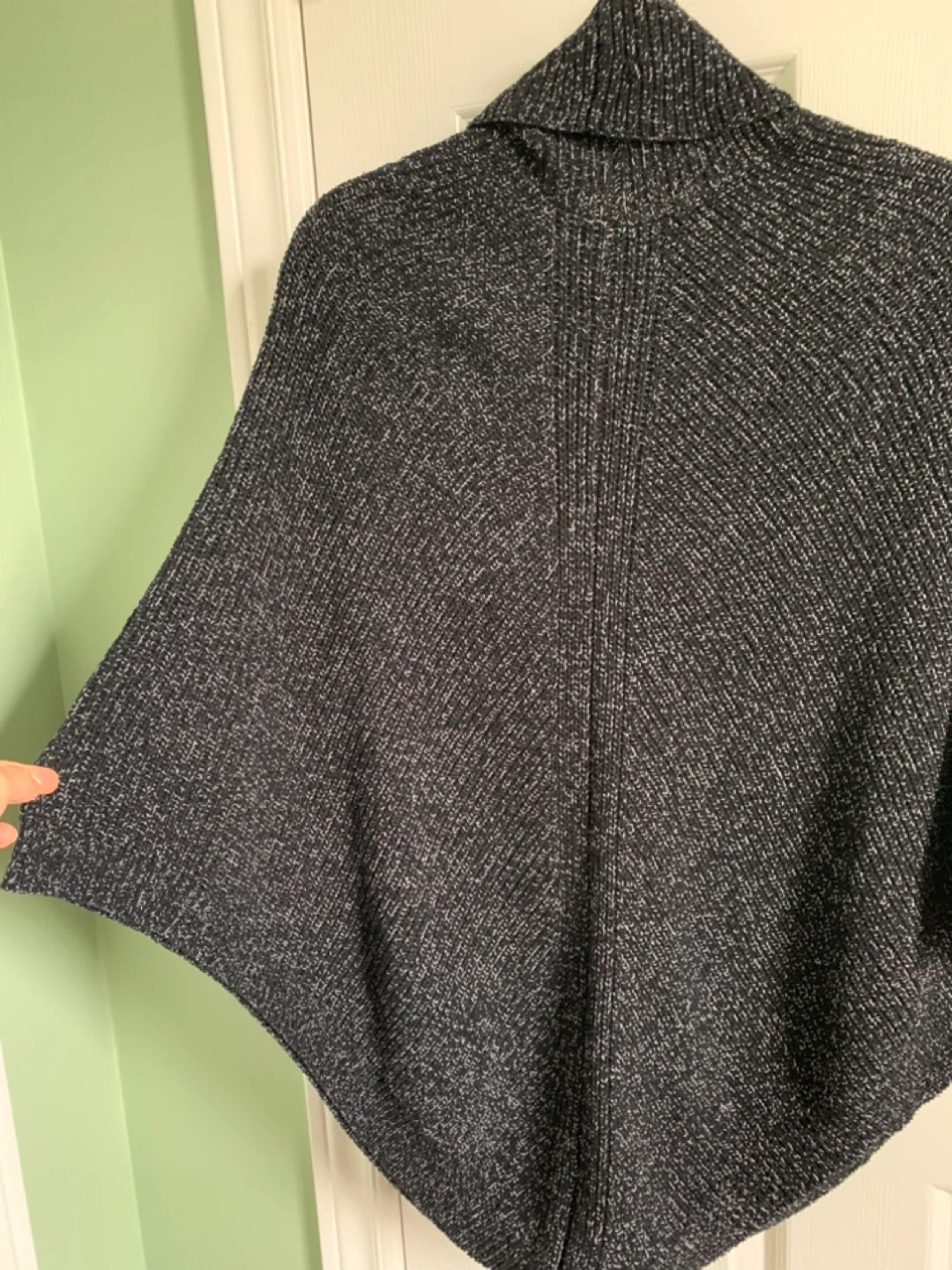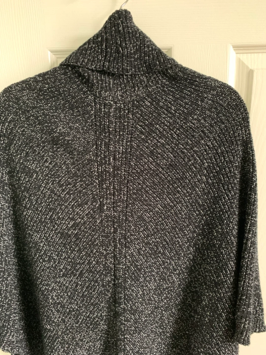 Cozy Roots poncho in a lovely grey and white knit! It's a one-size-fits-all item, made with a blend of 54% cotton and 36% acrylic, making it super comfy and warm. Perfect for layering on those chilly days