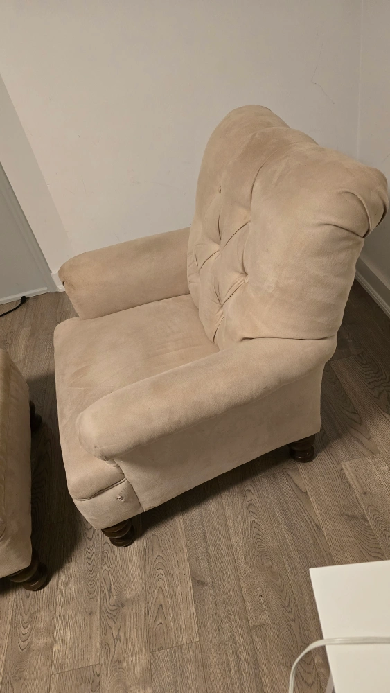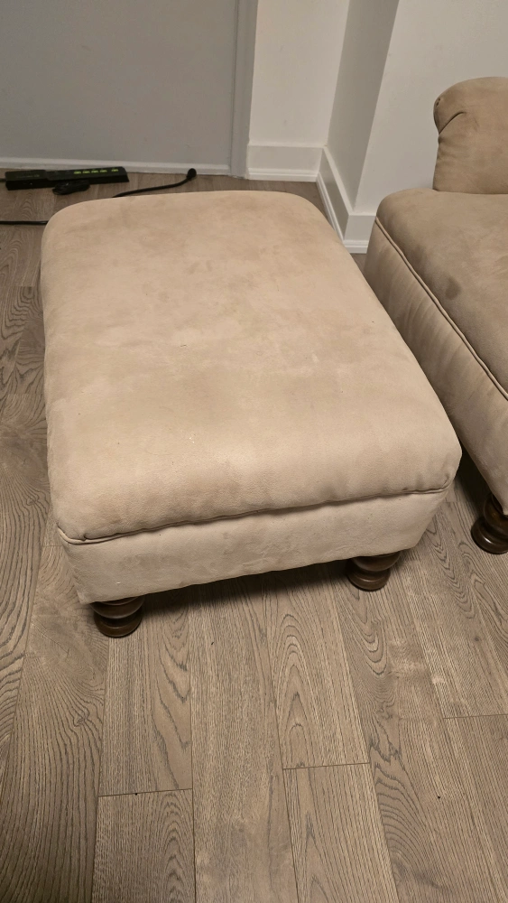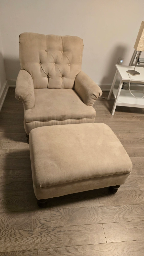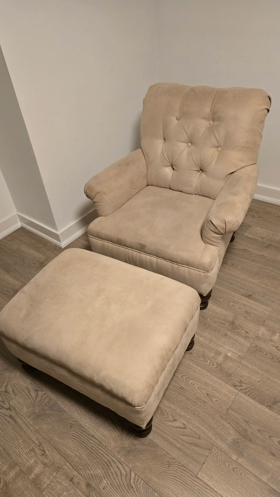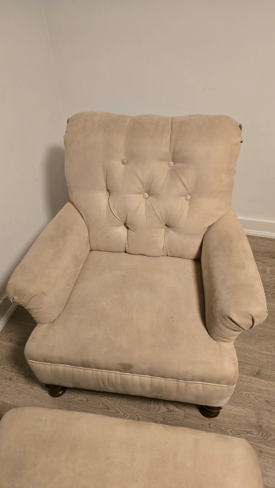 26Comfy armchair and ottoman set in a neutral beige colour. Perfect for a reading nook or living room. The set shows some signs of wear but is still in good condition for relaxing Chair 34.5 inches X 29 inches X 35.5 inches Ottoman 22 inches X 29 inches X 16 inches