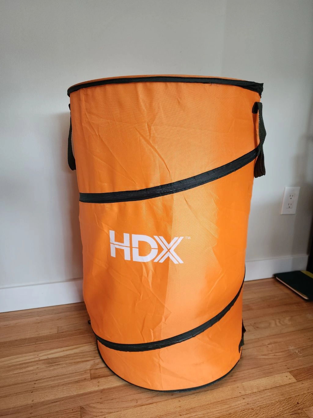 Here's a handy HDX pop-up trash can! It's orange and collapses for easy storage. Perfect for yard work or camping
