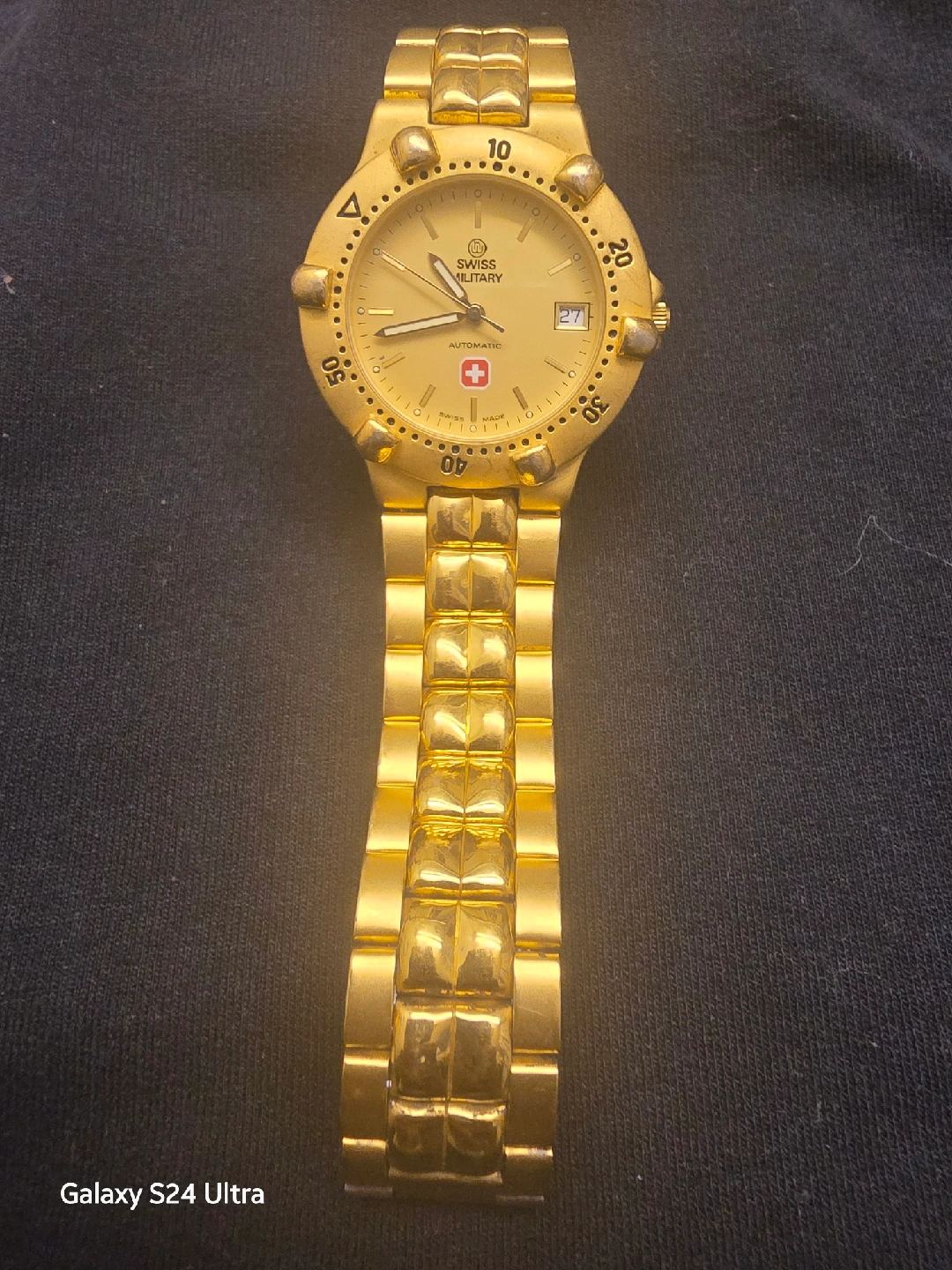 Selling a Swiss Military automatic watch in a gold tone. The watch features a date display and a Swiss-made automatic movement. It has a classic design with a Swiss cross emblem on the dial. A stylish and reliable timepiece!