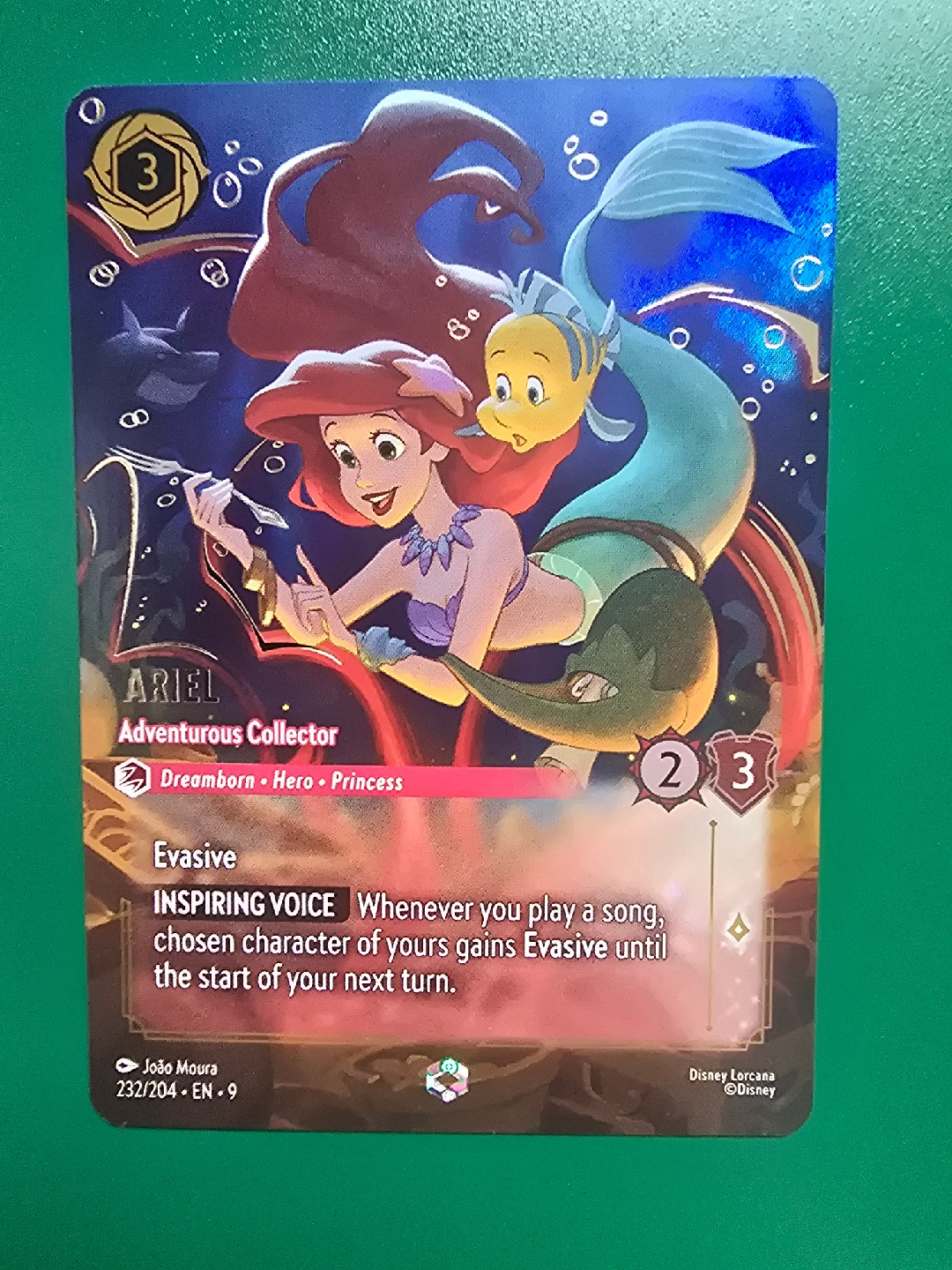 60Selling a Disney Lorcana card featuring Ariel, the Adventurous Collector! This card is a Dreamborn Hero Princess. It has the ability Inspiring Voice. Card number is 232/204 - EN - 9 Rare card Enchanted pack fresh. asking 120$