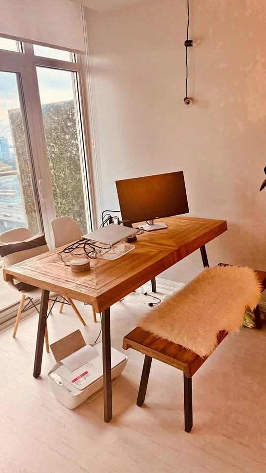 Structube dining table set with a recycled teak table and bench. Includes 1 table, 1 bench, and 2 white chairs. Dimensions of the table and chairs are in the photos. Bench dimensions: 45cm (W) x 121cm (L) x 40cm (H). Circular water mark at the end of the table. Pickup only in Liberty Village. Originally purchased for $530 + tax. If the ad is up, it is available.