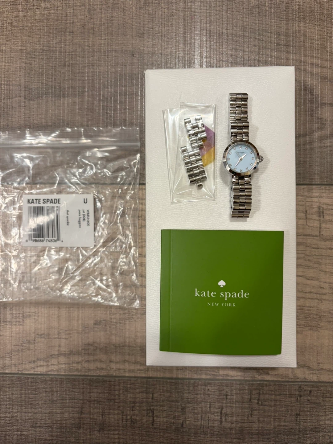 Kate Spade women's watch with a light blue dial and silver-tone metal band.