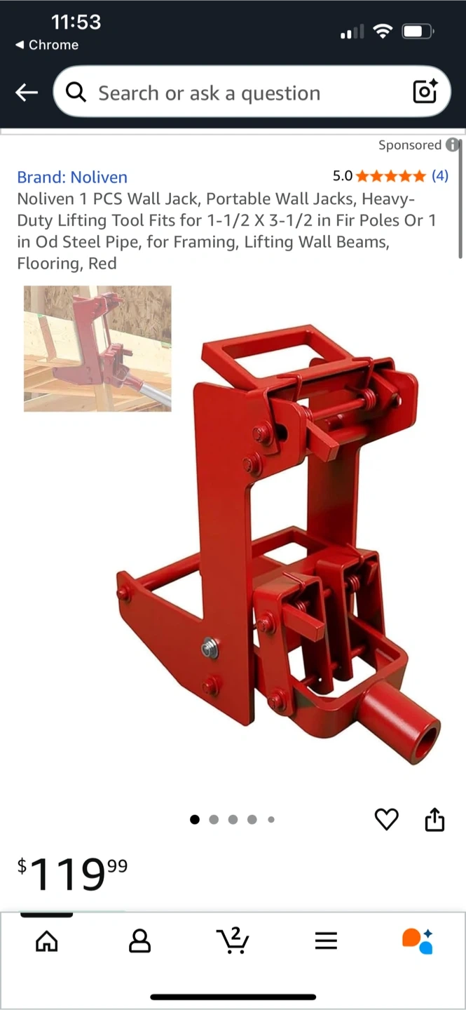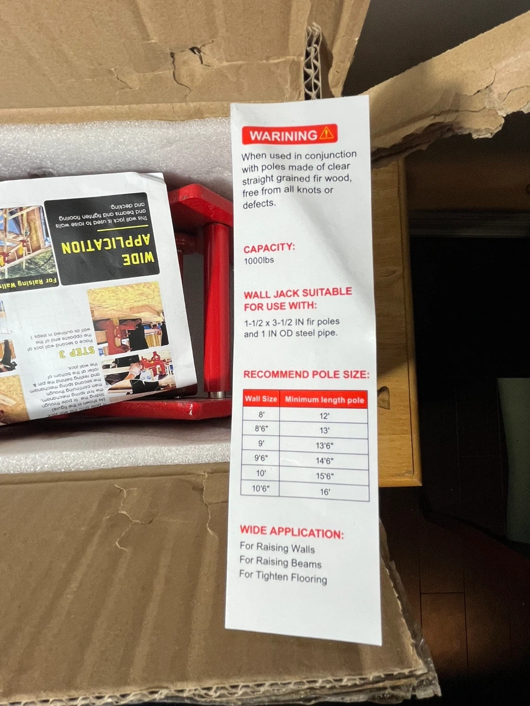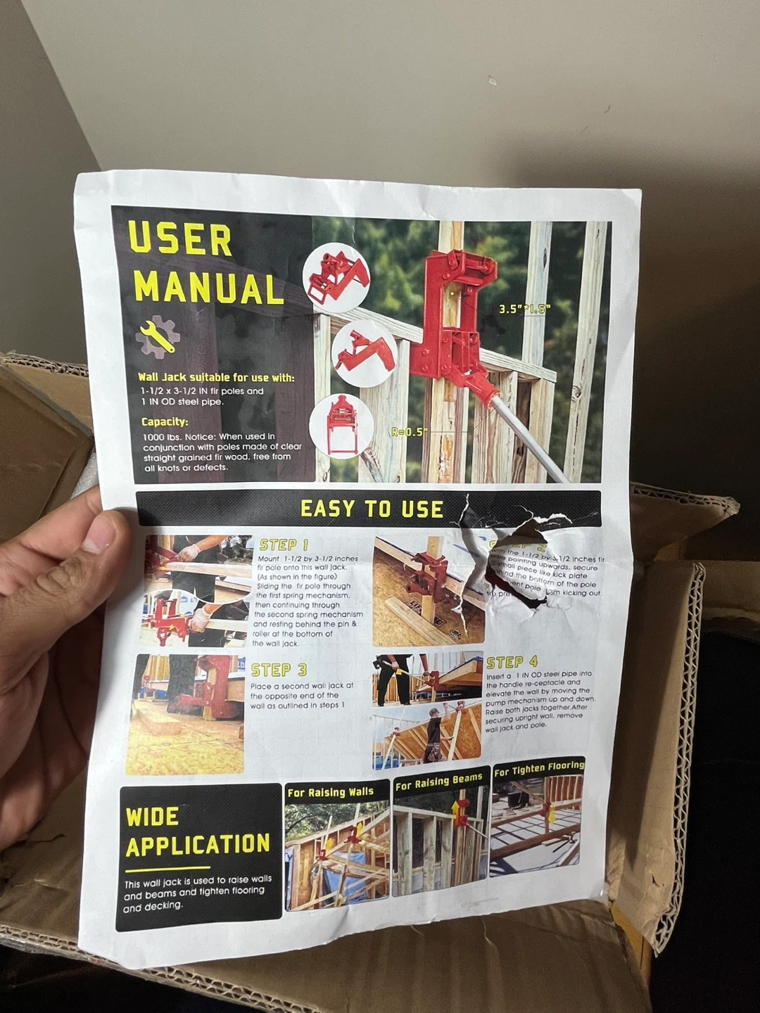I'm selling a brand new Noliven Wall Jack! It's a heavy-duty lifting tool, perfect for 1-1/2 X 3-1/2 inch fir poles or 1 inch OD steel pipe. It's great for framing, lifting wall beams, and flooring. It's still in its original box and includes the user manual