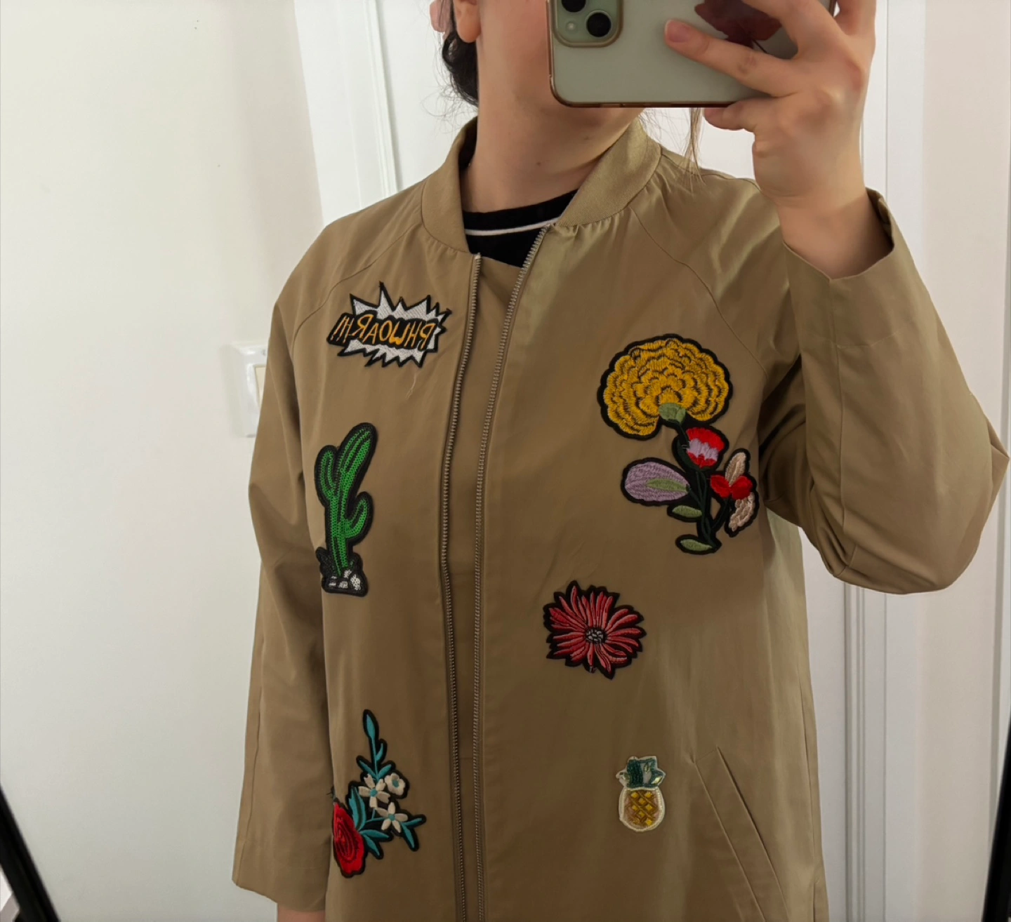 Selling a khaki-coloured jacket/trench coat with fun patchwork details! It's a unique piece that adds a playful touch to any outfit. The jacket is in like new and ready for a new home. Perfect for layering or wearing on its own for a casual, stylish look