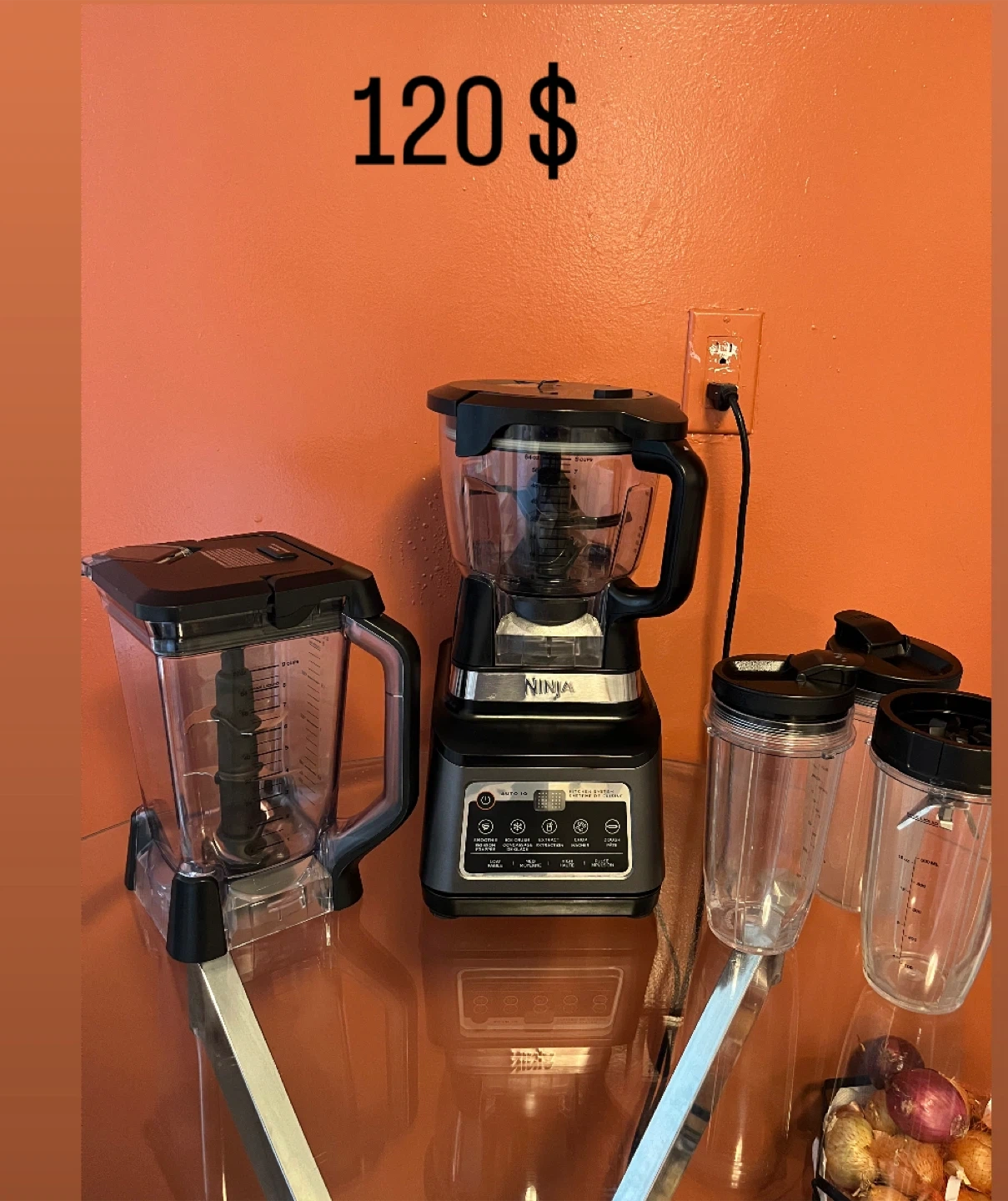 76Selling a Ninja Kitchen System blender. It comes with multiple attachments for different blending needs. Great for smoothies, food processing, and more!