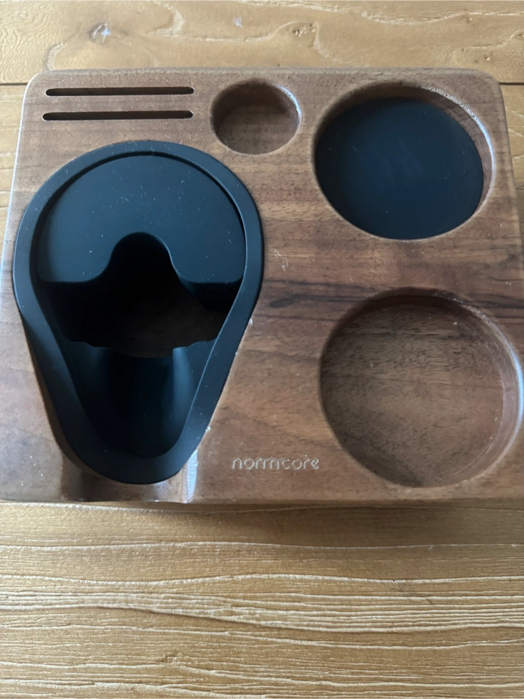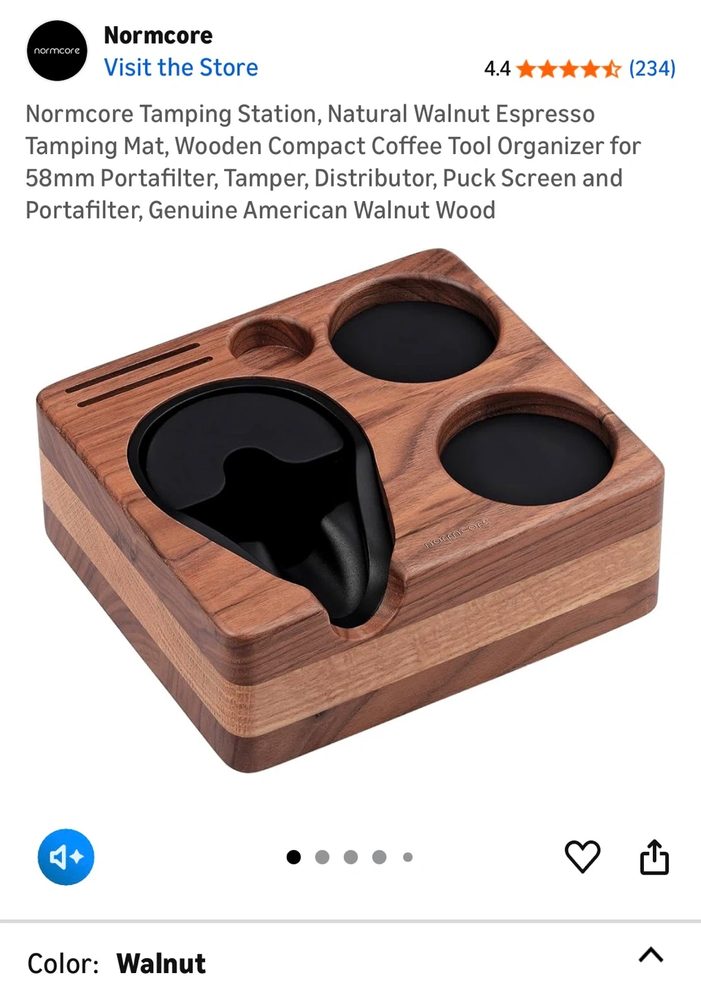 It's a natural walnut color and designed for portafilters, tampers, and other tools. It's a wooden compact coffee tool organizer, perfect for keeping your espresso setup tidy!