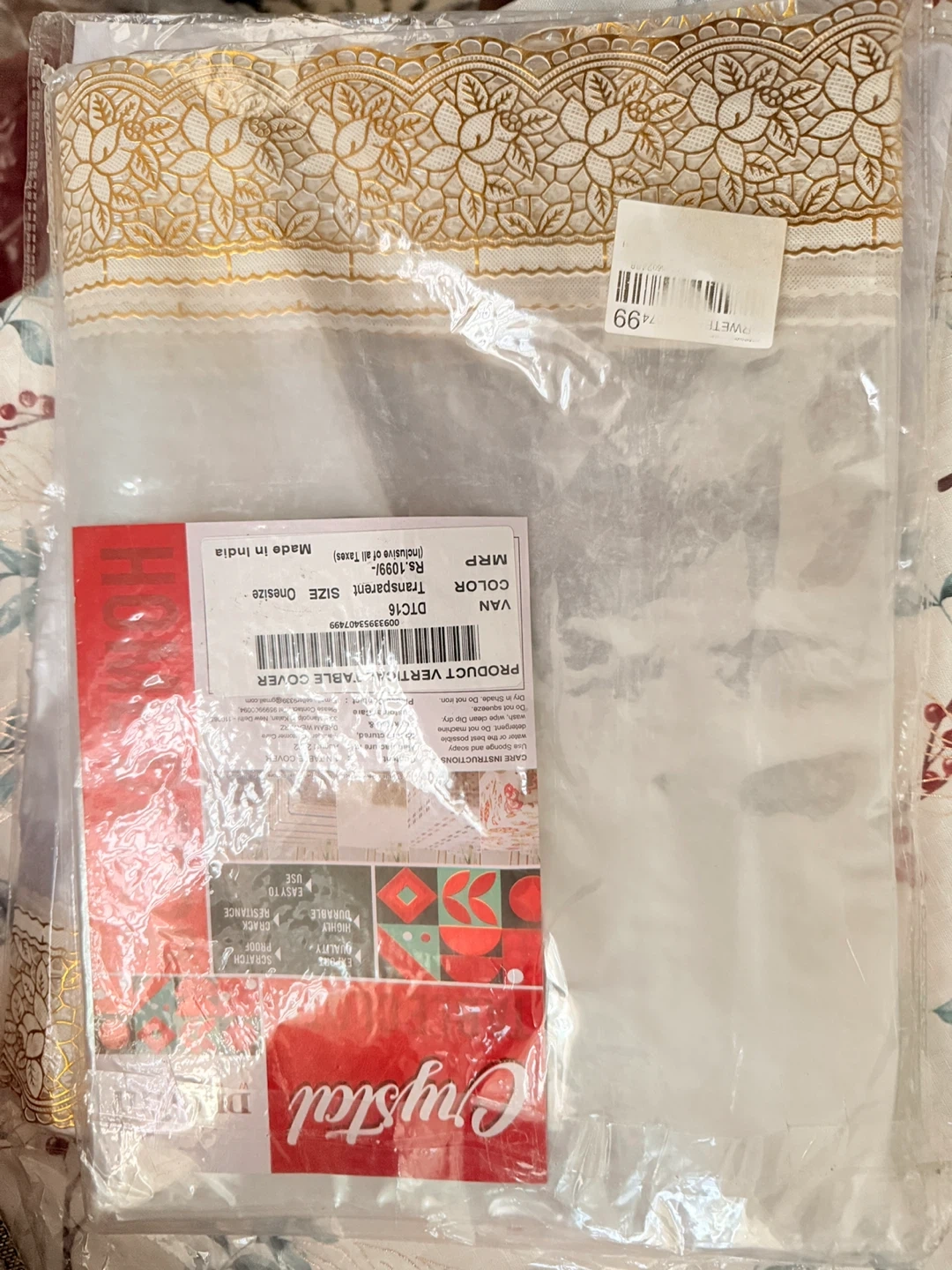 570I'm selling a brand new Crystal table cover, still in its original packaging! The size is 60x90 and the color is transparent. It's made in India. I have two pieces.