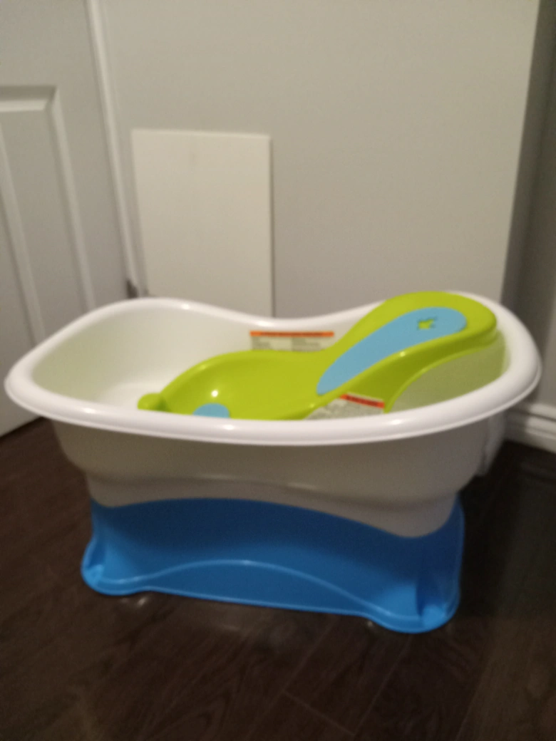 Summer Infant Comfort Height Bath Tub with a blue base and green sling seat insert! It's in great condition and ready for a new home.