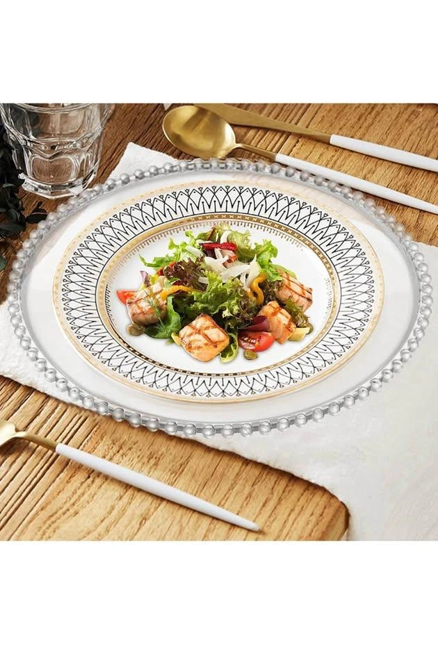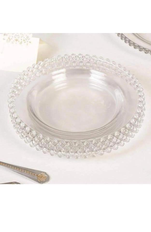 Bead charger plates are made of high-quality plastic, fashioned in a classic round shape. The attractive beaded design around the edges will draw attention and enhancing food presentation at your catered events