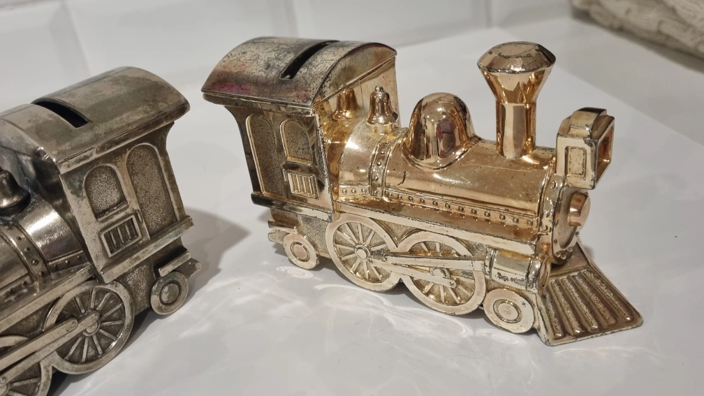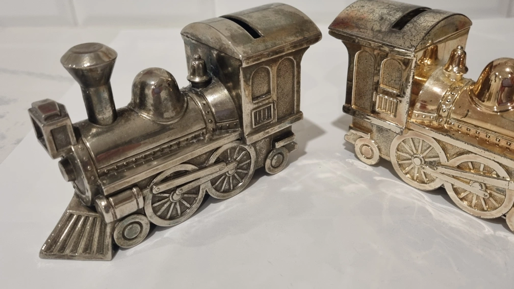 109Selling a set of two train coin banks! One is silver and the other is gold. They're in good condition and would look great on a shelf or desk