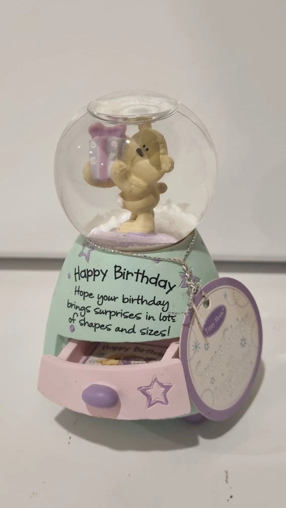 109This Fuzzy Moon snow globe is perfect for a birthday celebration! The base reads 'Happy Birthday' and 'Hope your birthday brings surprises in lots of shapes and sizes!' It's in great condition and ready to bring a little joy to someone's special day
