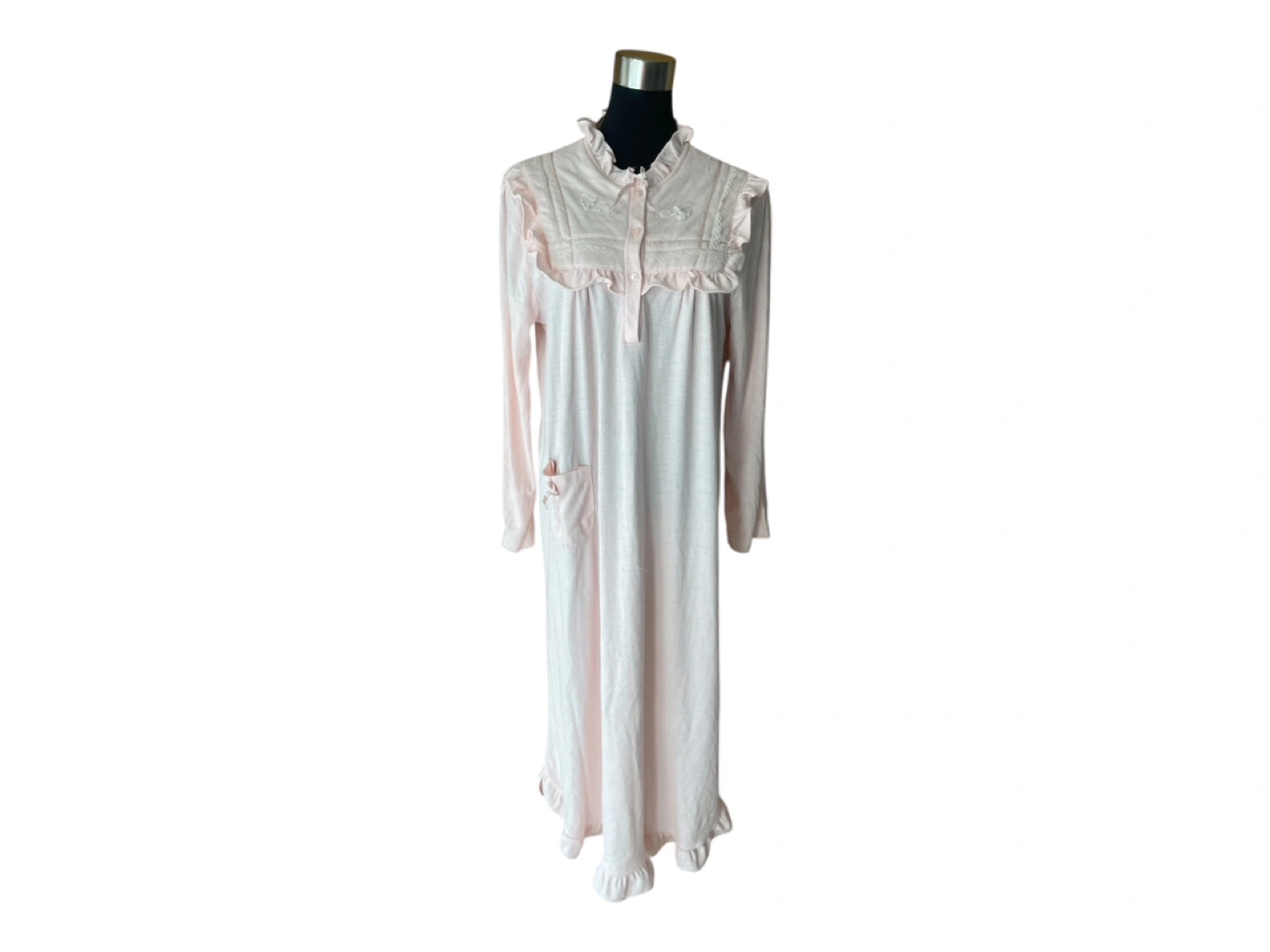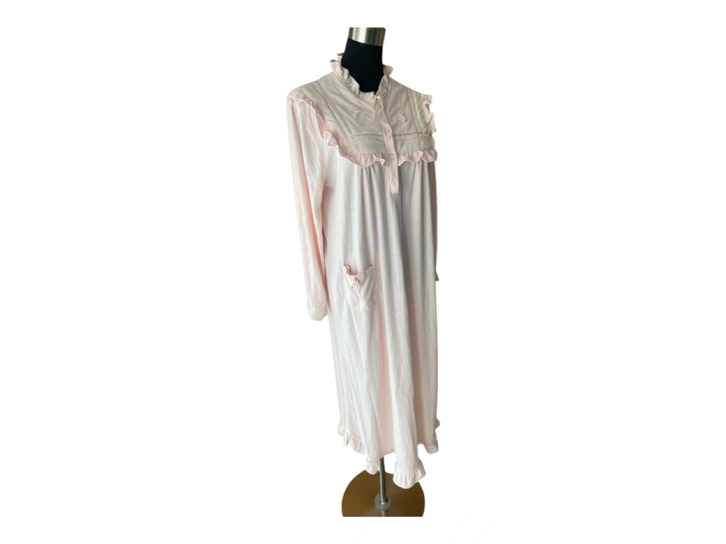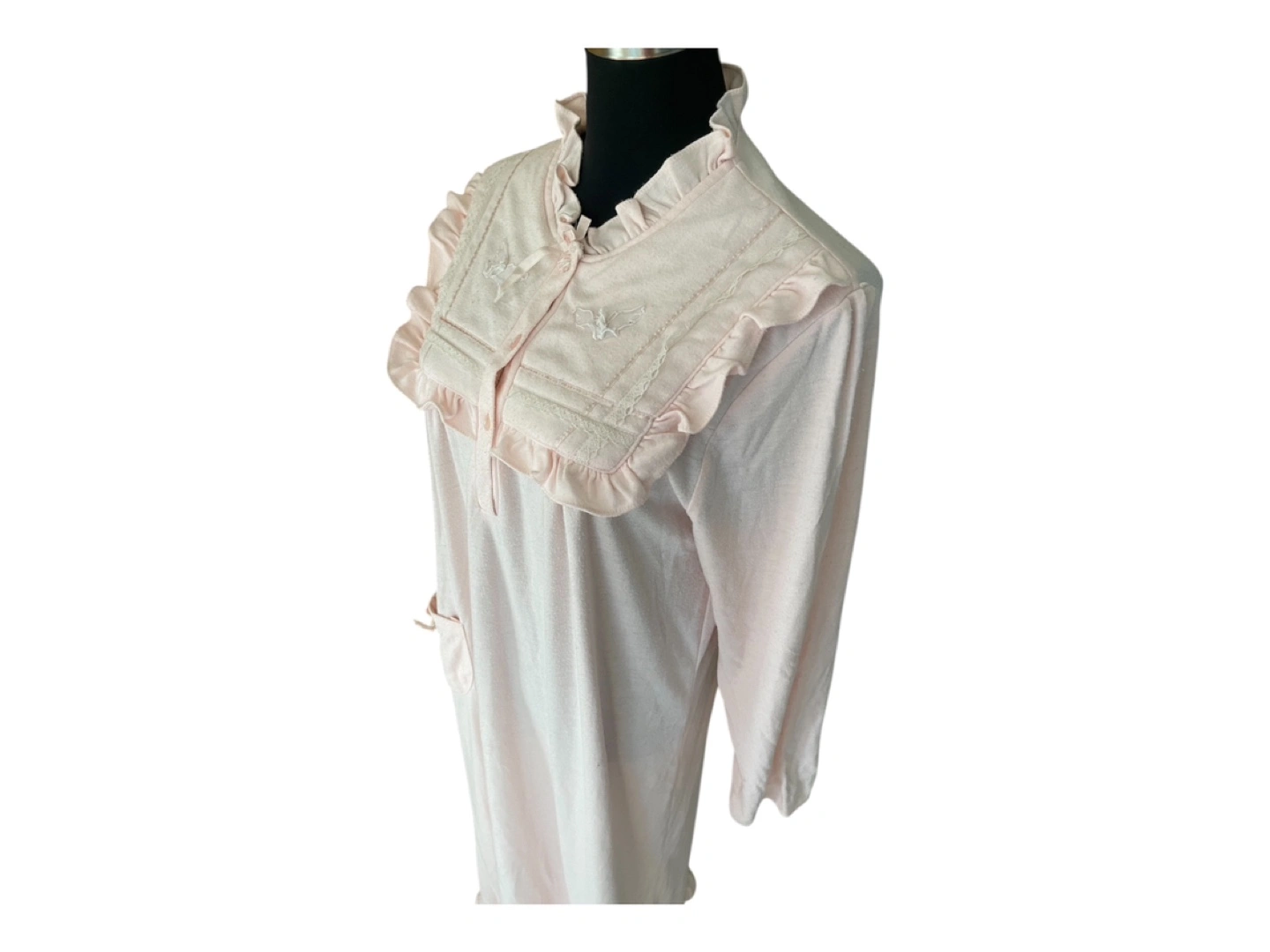 RARE Vintage 80s Pink Nightgown Pajama Dress Cotton Ruffle Details Button Up Collar S/M