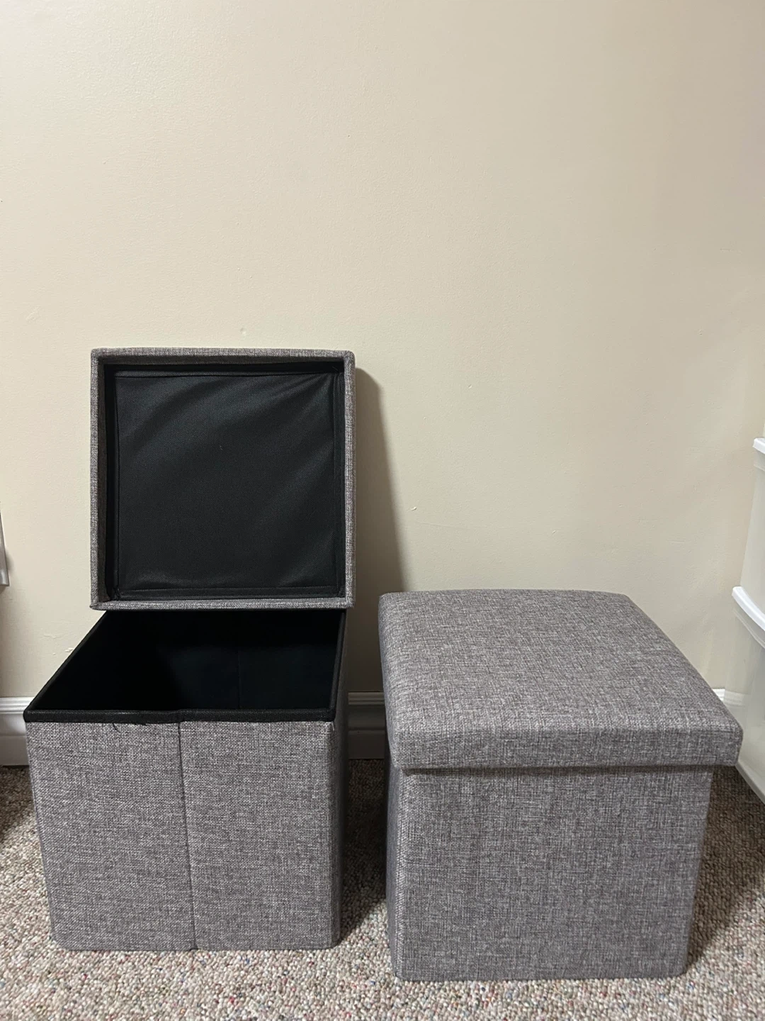Here's a handy grey storage ottoman! It's in great shape and ready to help you organize your space. The ottoman provides a good amount of storage inside, perfect for blankets, toys, or whatever you need to tuck away