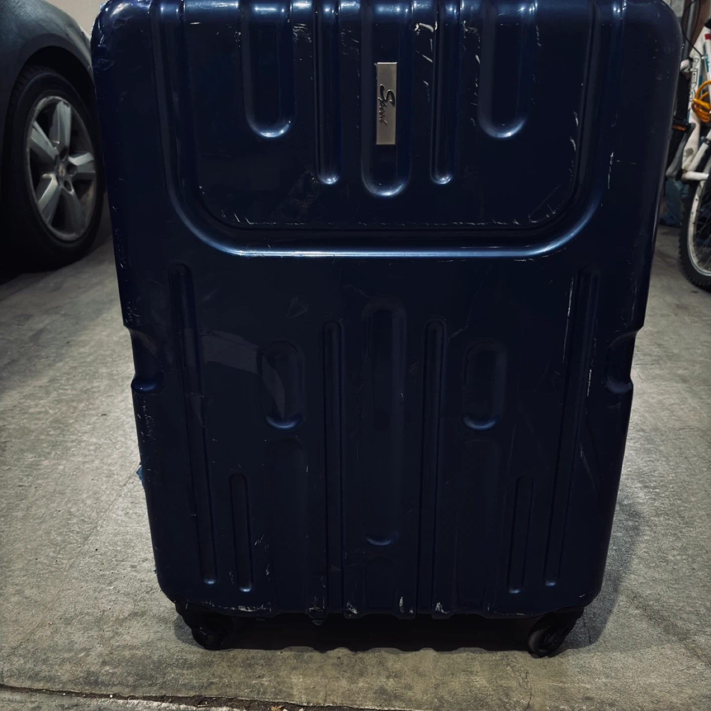 Selling a navy blue luggage suitcase. It's in used condition with some visible wear and tear, as shown in the photos. Still has lots of life left and is ready for your next trip!