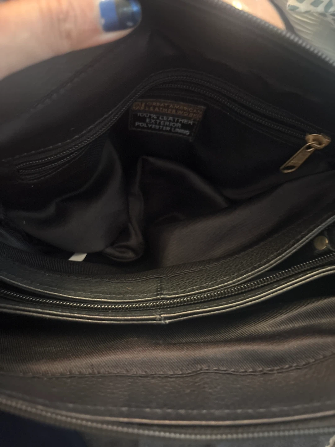 Selling a black leather crossbody bag. It has a front pocket with a buckle detail and a zippered pocket on the side. It's in good condition and perfect for everyday use
