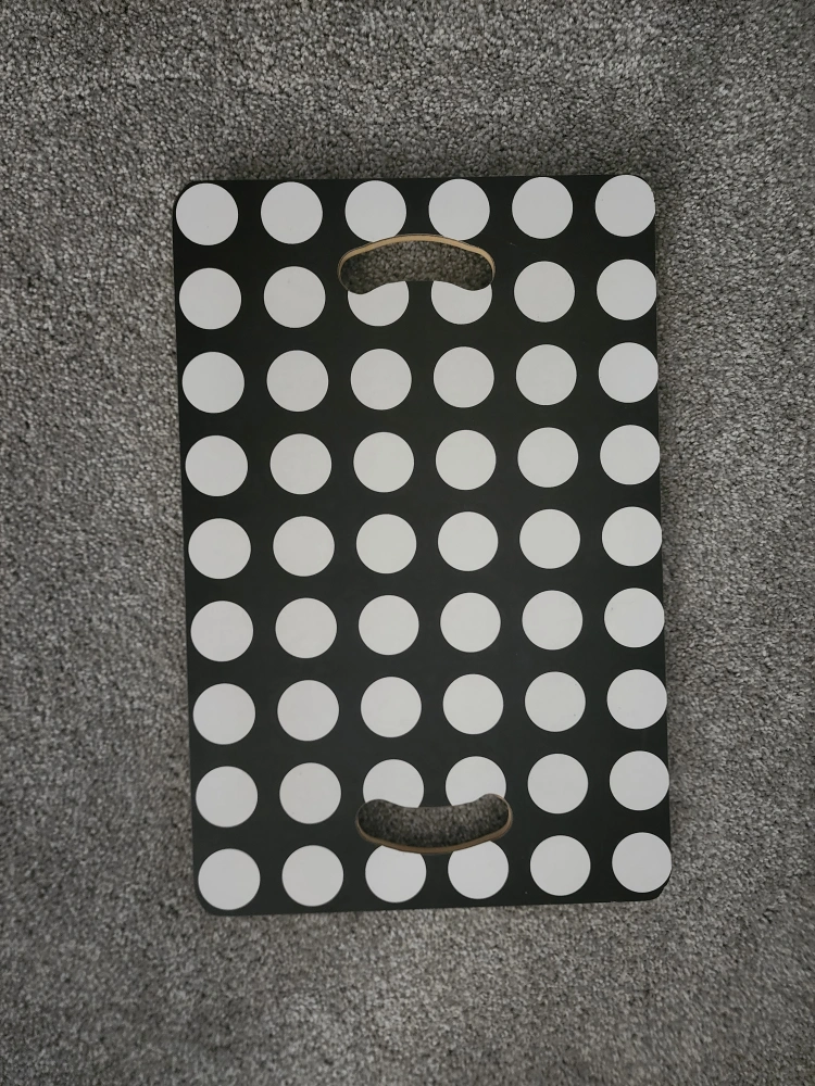 Selling a bed tray with a fun black and white polka dot pattern! It's perfect for breakfast in bed, working from home, or just relaxing with a good book. It has convenient handles for easy carrying and foldable legs for easy storage. It's in great condition and ready for a new home