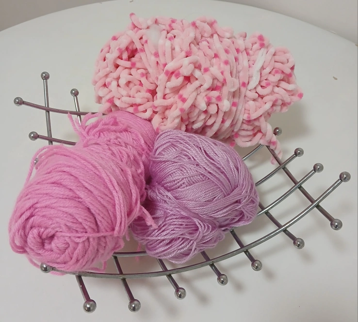 Giving away a bundle of yarn in various shades of pink and purple! Perfect for your next knitting or crochet project. There's a fluffy pink yarn and two other balls of yarn.