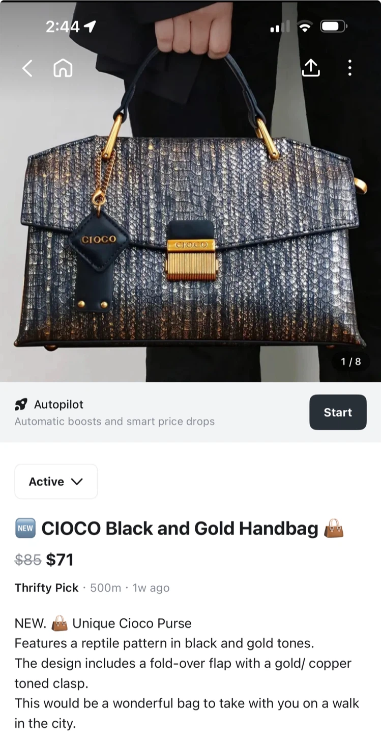 Selling a brand new Cioco handbag! It features a unique reptile pattern in black and gold tones. The design includes a fold-over flap with a gold/copper toned clasp. Originally priced at $85, now available for a great deal!