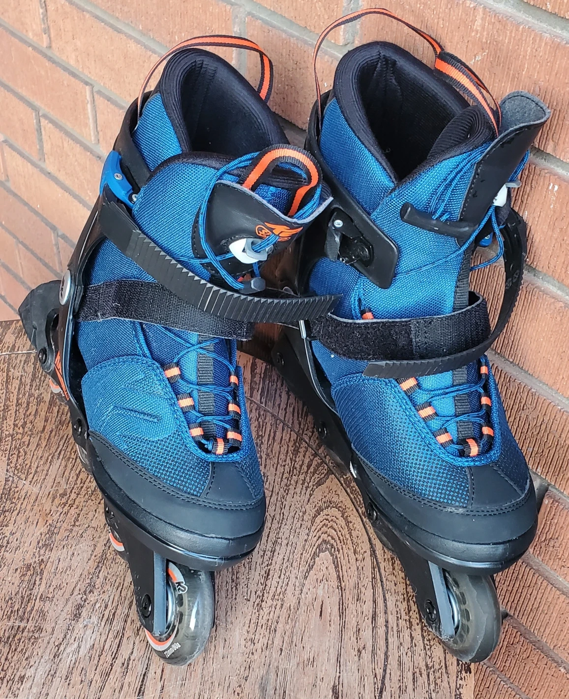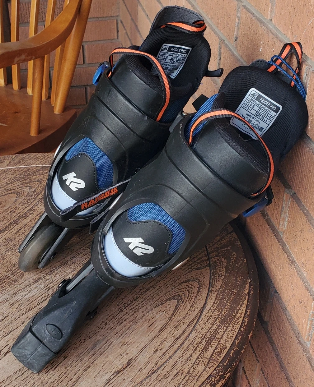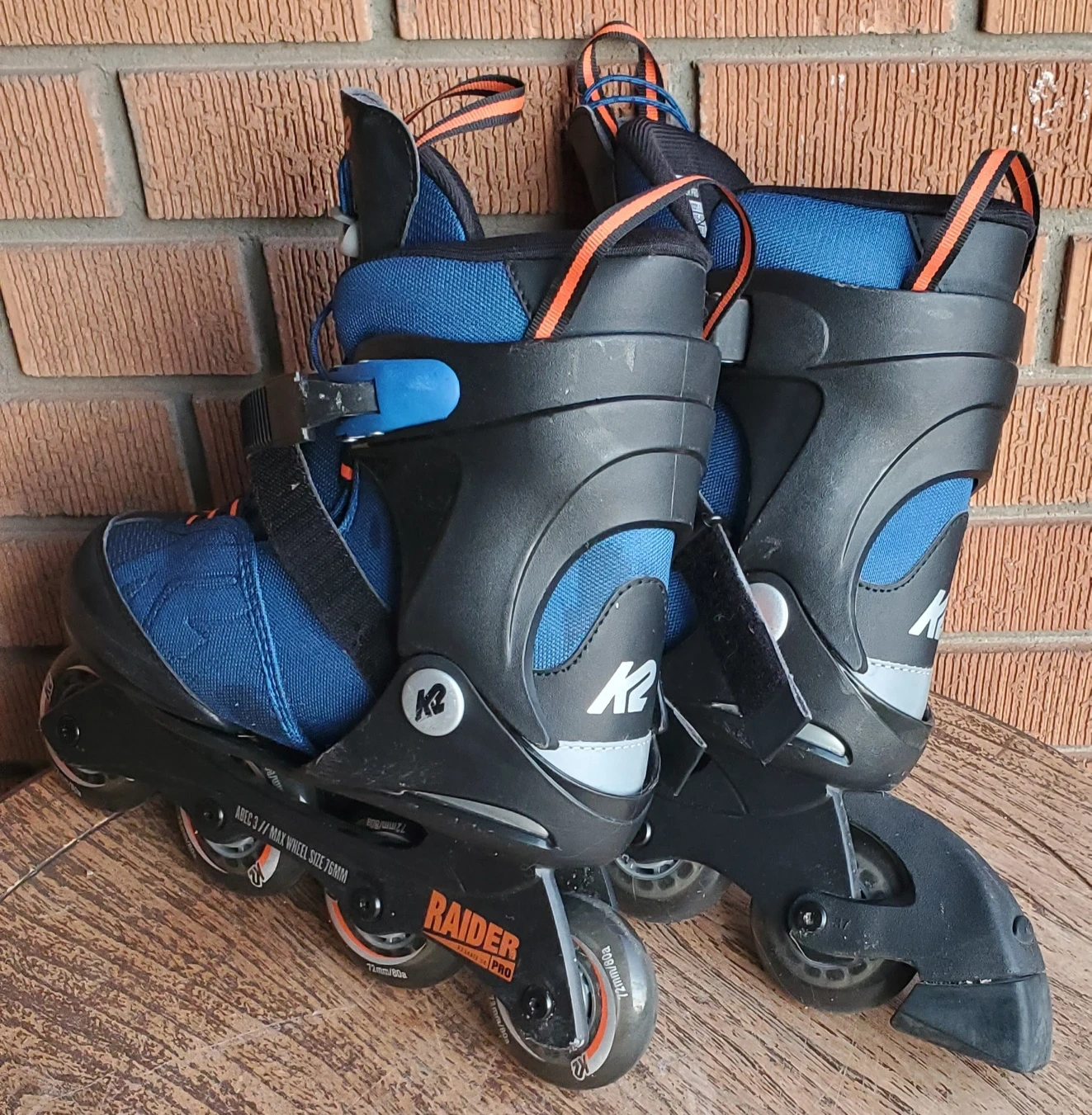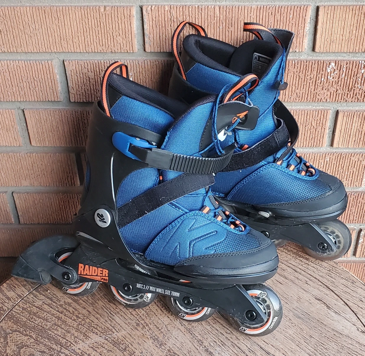 In very good conditon kids Raider K2 inline roller blades. Adjustable to fit sizes 4 to 8. Very minor wear from normal use, no damage. Wheels turn easily and function like new. Velcro straps and lacings in perfect condition. Boots in nearly new condtion, no rips or tears.